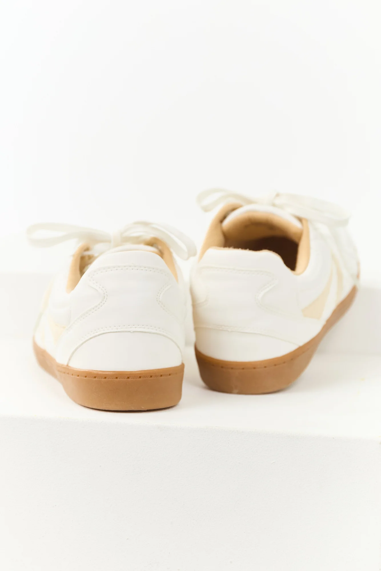 Step up your style with these white low top sneakers featuring faux leather contrast details. These comfortable sneakers with a lightly cushioned insole and contrast rubber sole offer both style and substance. The platform height is 1 inch, with a circumference of 11 inches. Imported.