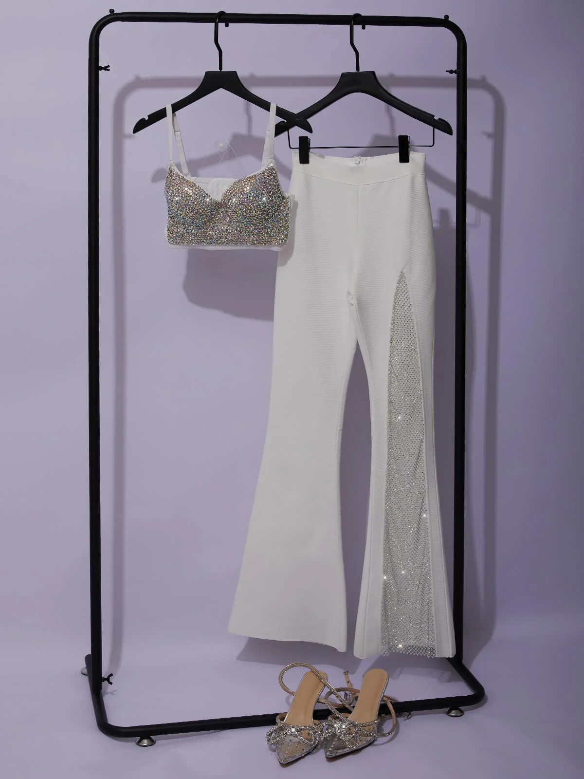 Step up your style with our White Mesh Diamond Bandage Wide Leg Pants. Crafted from a high-quality bandage material, featuring an extreme high-waisted design, and a wide leg fit, these pants offer both comfort and sophistication. The invisible zipper at the back adds to the sleek look. Pair them with our Brianna Crystal Bustier Top for a complete chic ensemble. Made of 90% Rayon, 9% Nylon, and 1% Elastane with a high stretch factor. Dry clean recommended. Please note, color may slightly vary due to lighting. Get the true color representation from our product images. Model is wearing size S.