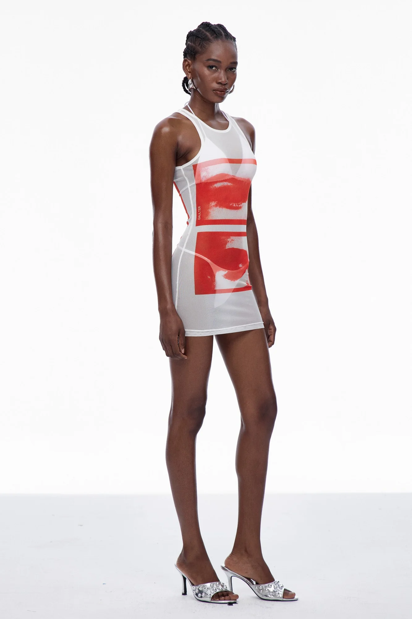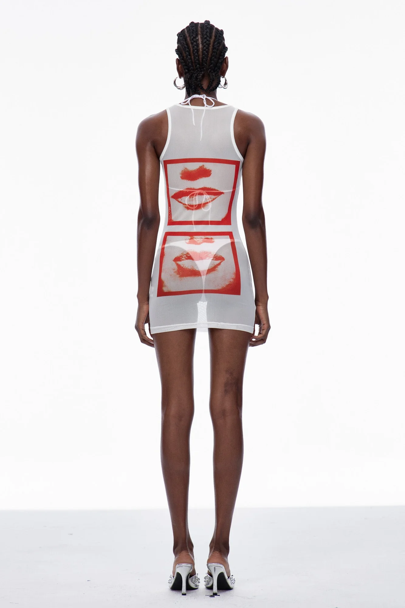 The White Mesh Mini Dress embodies a fusion of delicate mesh fabric and a captivating print, exuding sophistication with a playful touch. Crafted for comfort with a slight stretch, this dress accentuates your silhouette elegantly with its modern mini length. An ideal choice for various stylish events, it strikes a refined balance between texture and design, offering versatility for any wardrobe. Complete your look with this versatile piece. Stretch Factor: Slight Stretch. Care Instructions: Gentle machine wash recommended. Please note, this dress does not feature an inner layer for added breathability.