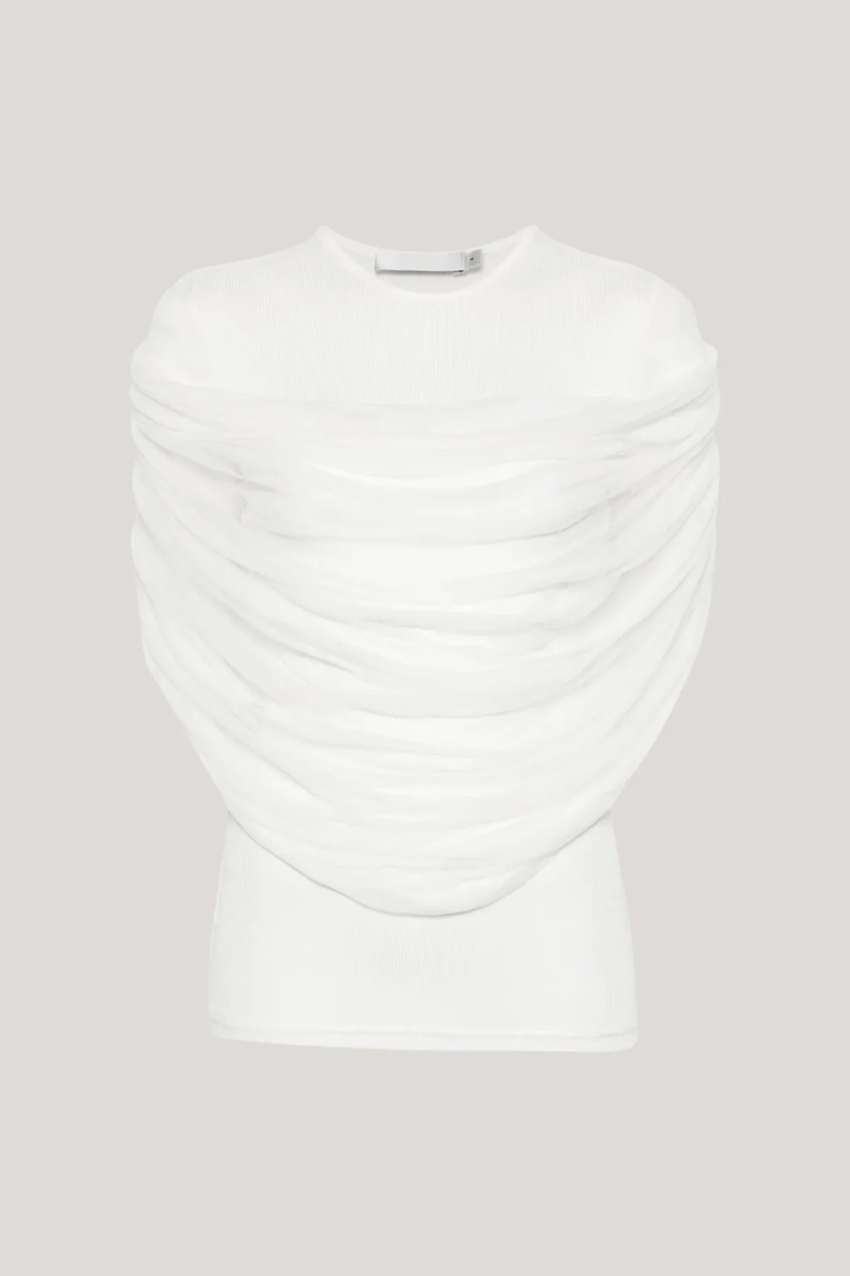 Elevate your wardrobe with this modern and stylish White Mesh Ruched Top. Crafted with a blend of breathable mesh and flattering ruched fabric, this top offers a unique look. Made of 50% Polyester and 50% Cotton, with a slight stretch for added comfort. The clean, gentle machine wash ensures easy care. Please note that color may vary due to lighting. Experience sophistication in every wear!