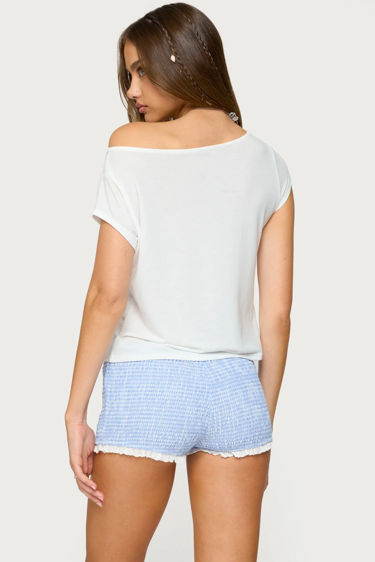 Elevate your style with the White Off Shoulder Anabella Top crafted from a blend of Cotton, Polyester, and Spandex for comfort and durability. This versatile top features an off-shoulder design that exudes elegance and sophistication. Perfect for any occasion, whether youre going out with friends or attending a special event. Easy to maintain, machine wash at 30ºC, iron at 110ºC, and avoid bleach and tumble dry for long-lasting wear.