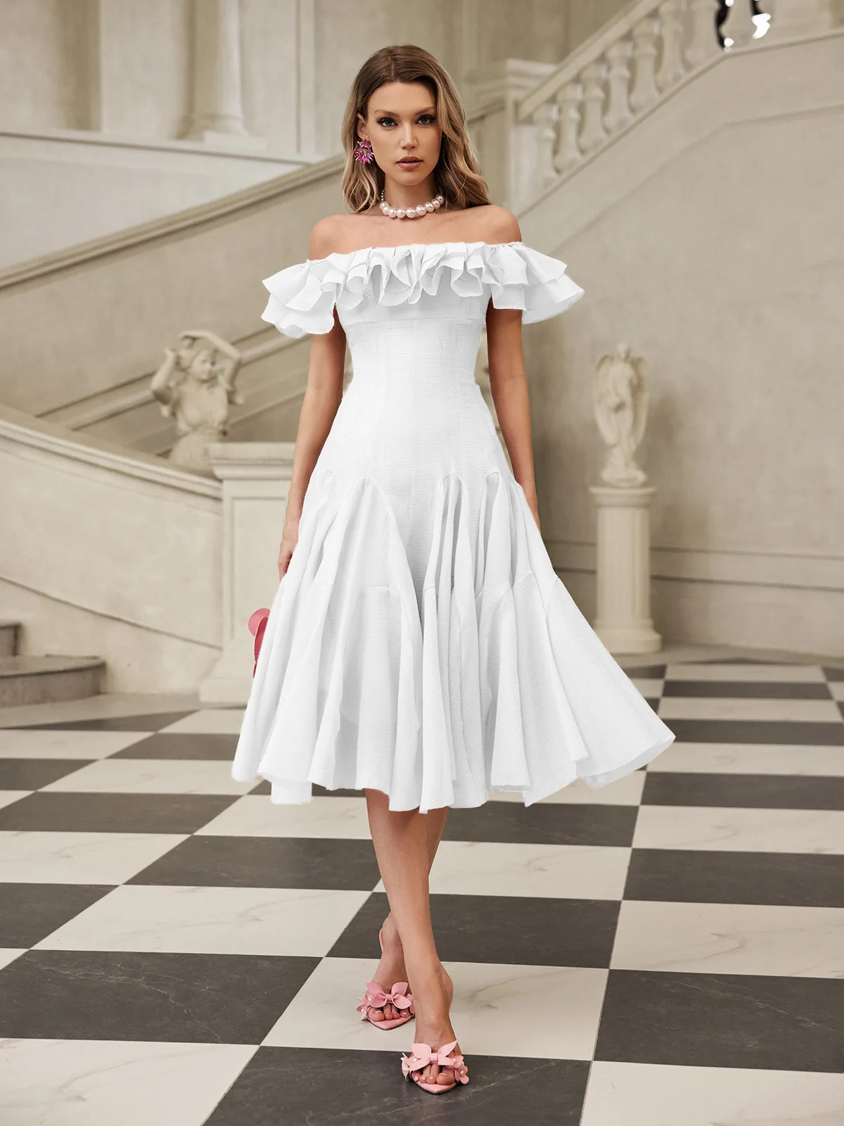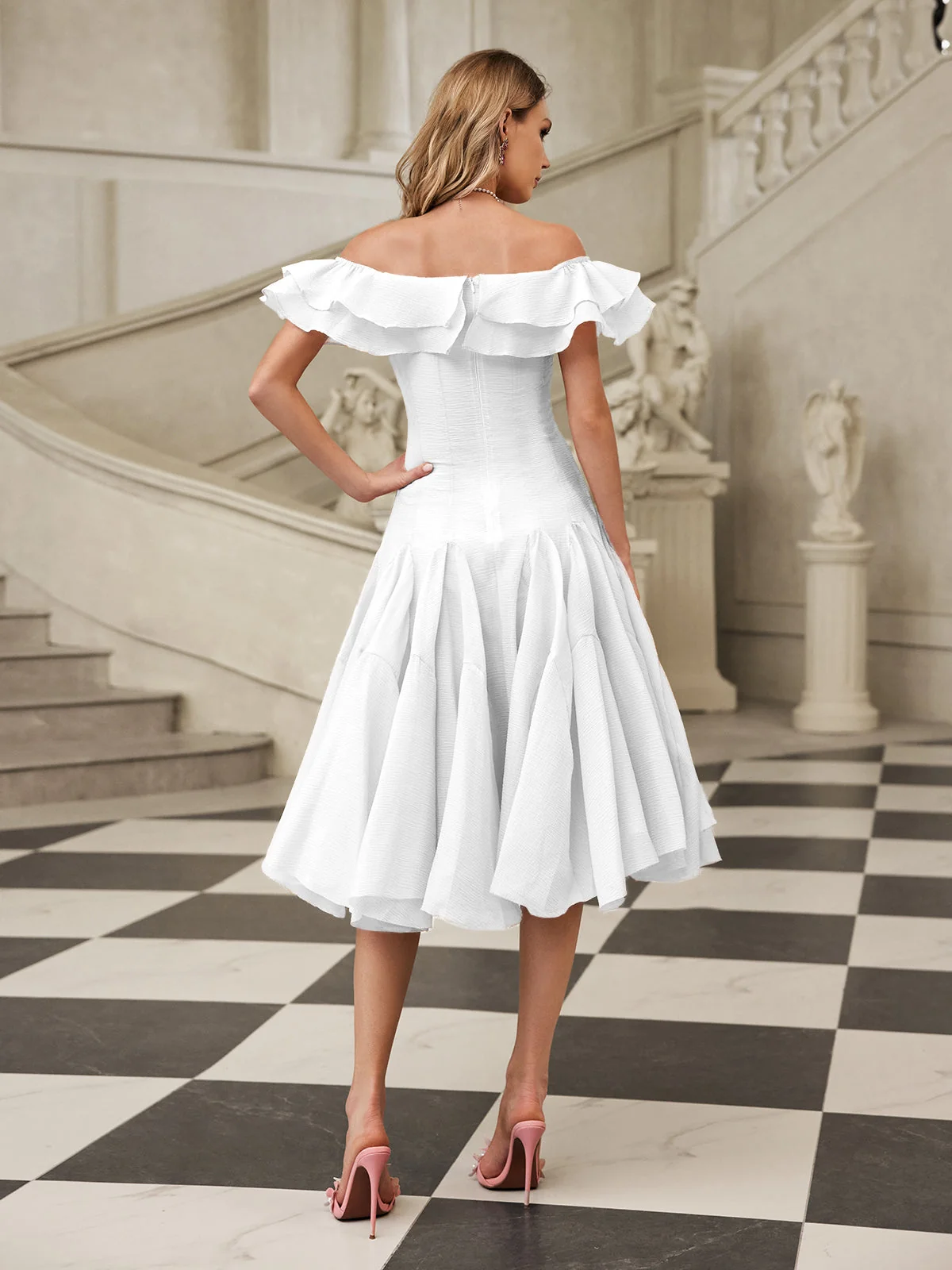 Elevate your style with the White Off-Shoulder Ruffle Midi Dress. This elegant dress features a flattering off-shoulder neckline and delicate ruffle detailing that adds a romantic touch. Perfect for casual outings or special occasions, the midi length offers versatility. Crafted with 100% Polyester for a comfortable fit. The dress effortlessly combines charm and sophistication, making it a must-have. Invisible zipper opening at the back with slight stretch. Dry clean only.