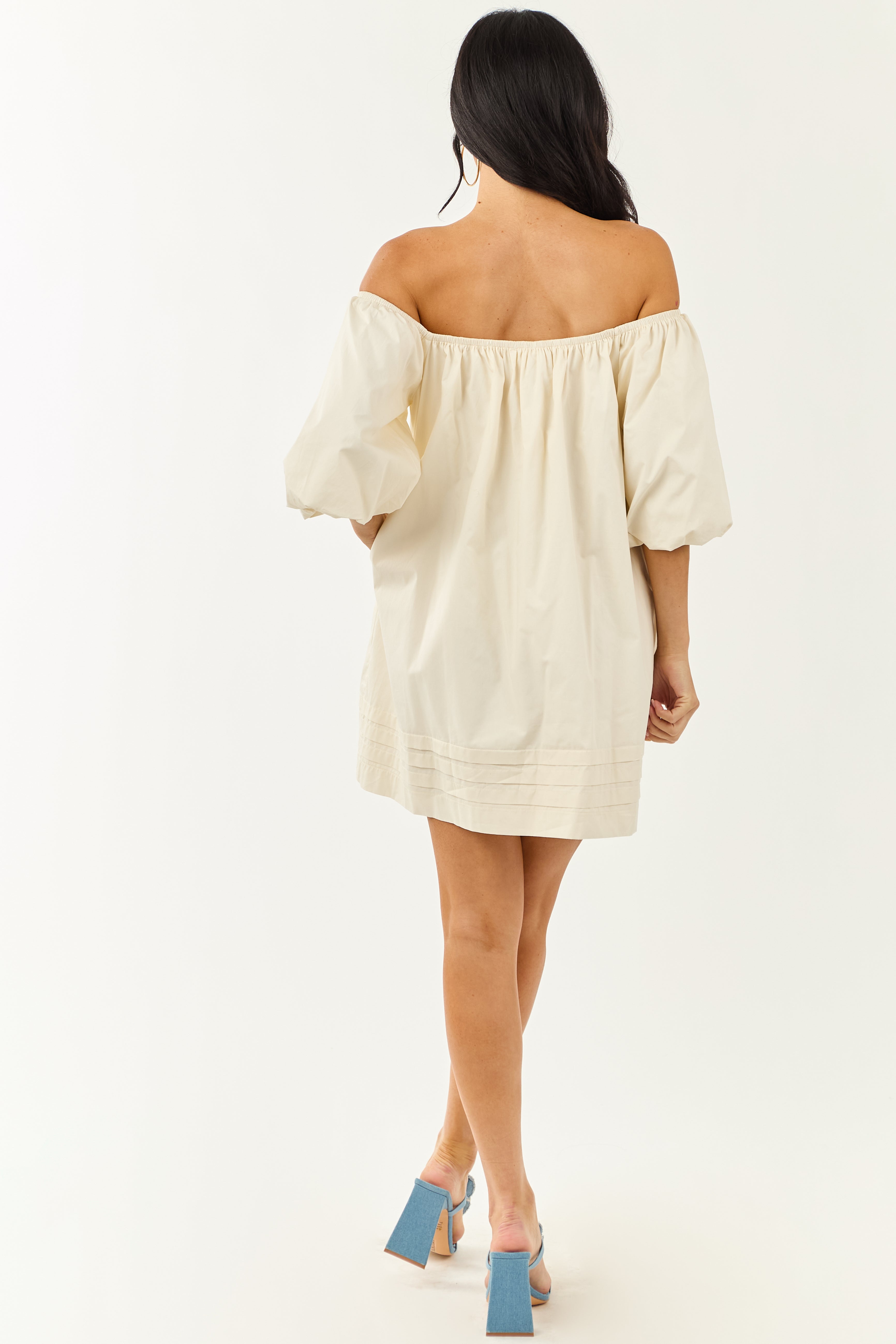 Indulge in the effortless charm of this white off-the-shoulder mini dress crafted from breezy cotton. Embrace the relaxed tent fit silhouette with an ultra-mini length, elastic neckline, and cuffs. Perfect for summer adventures, this dress features half puff sleeves, side pockets, and is lined for comfort. Elevate your style with this non-stretchy lightweight dress!