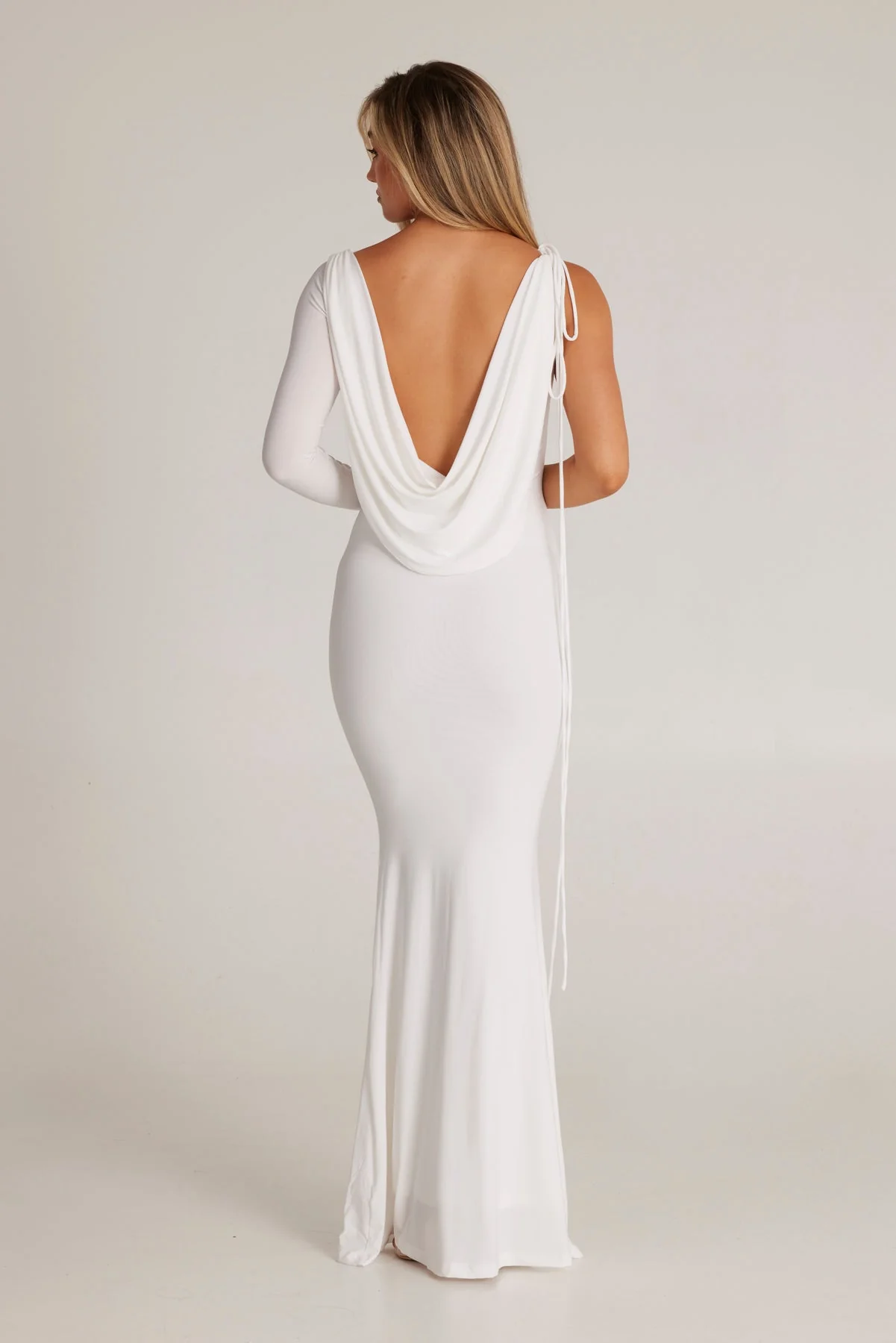 Discover the elegance of the White One Shoulder Maxi Dress with reversible design from Night Novas. Crafted with two layers of stretch fabric, this classic and timeless gown offers versatile styling options, featuring both front plunging drape and a high neck. Perfect for special formal events. Material: 83% Polyester, 17% Spandex. Enjoy the slight stretch for a comfortable fit. Care: Machine wash gentle. Note: Color may vary due to lighting. Model size: S.