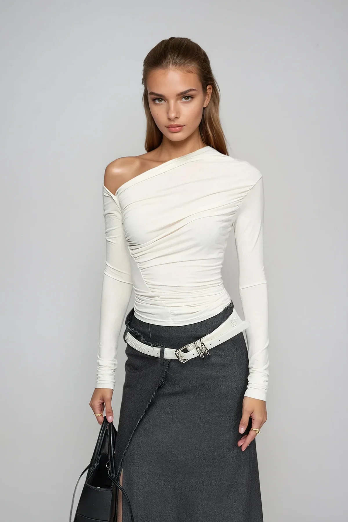 Elevate your wardrobe with the White One Shoulder Ruch Long Sleeve Top. This modern piece features an asymmetric neckline, delicate ruching, and sleek tailoring for a sophisticated silhouette. Perfect for day or evening wear, the clean white color adds versatility to your outfit options. Slight stretch fabric ensures comfort and style. Make a statement with this chic essential. Color may vary due to lighting. Gentle machine wash recommended.