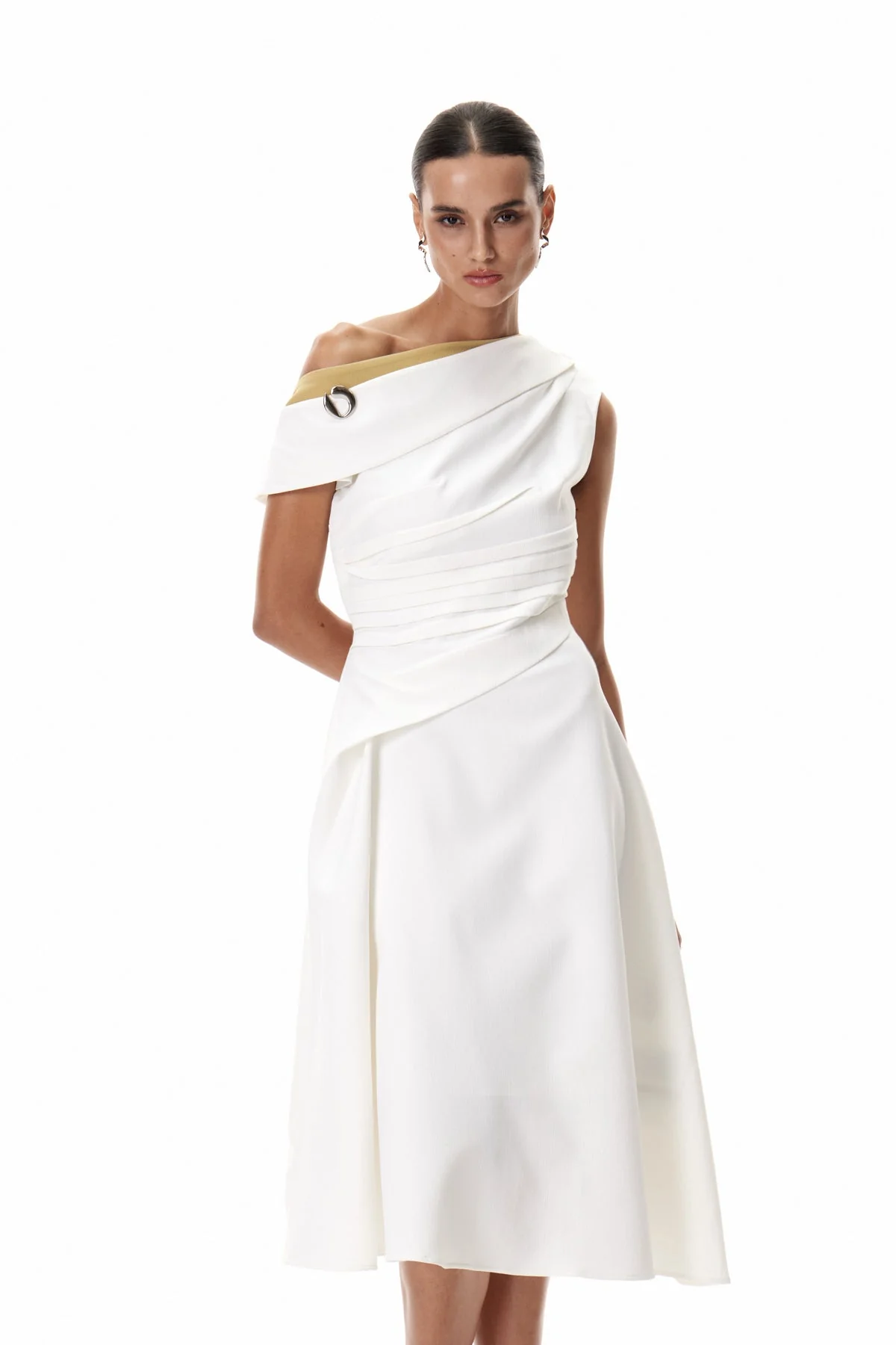Elevate your elegance with the White One Shoulder Ruched Midi Dress. This sophisticated dress features an asymmetrical neckline and elegant ruching, combining modern design with timeless appeal. Ideal for formal events and upscale gatherings, the midi length and single shoulder design infuse a contemporary edge into your refined style. Crafted to flatter your figure and ensure a balanced look, this dress is a chic essential for any fashion-forward individuals wardrobe. Color may vary due to lighting. Available in sizes S, M, L, and XL. Stretch Factor: Non-Stretch. Care: Gentle machine wash.