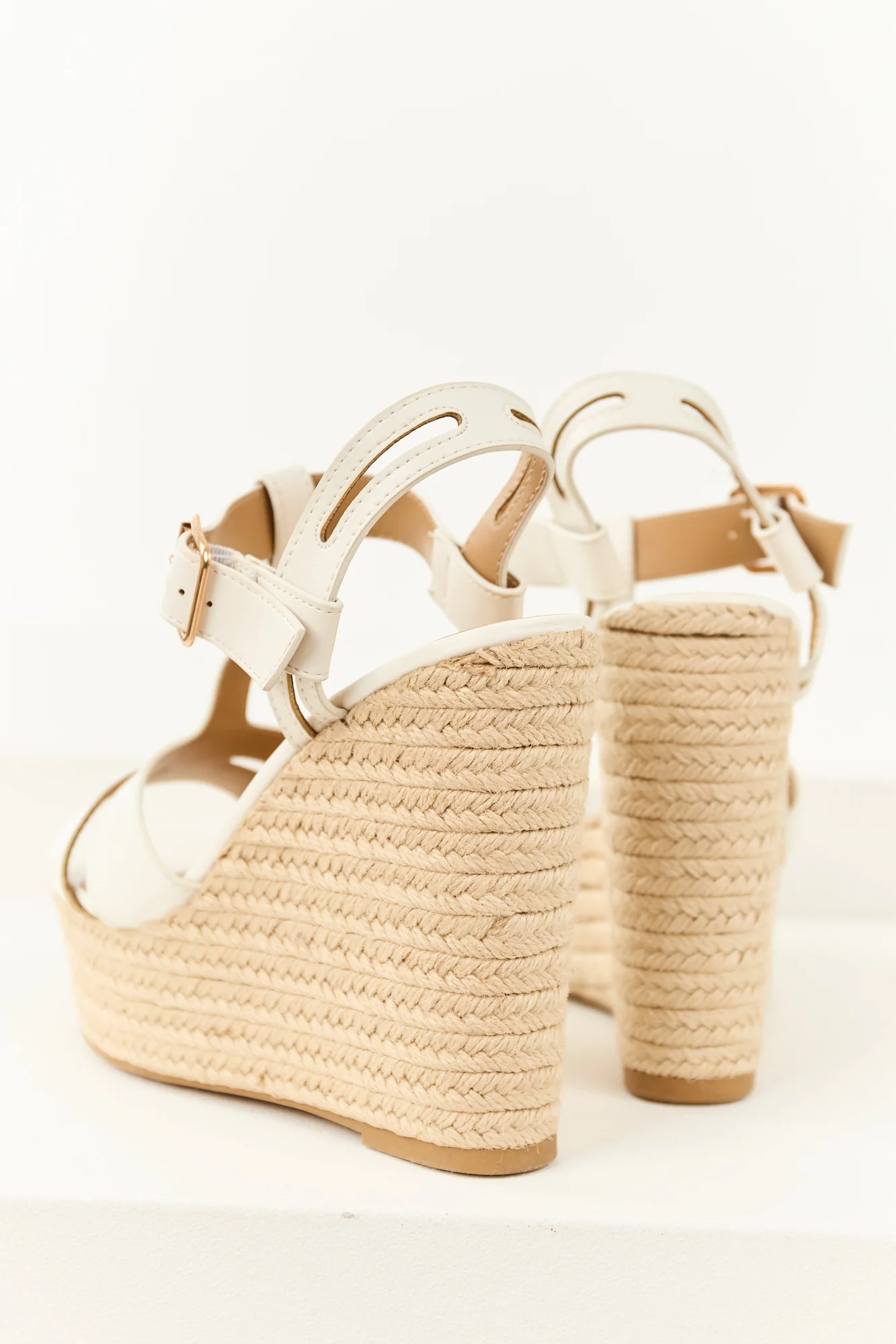 Step up your style with these white platform wedges featuring a trendy cut-out T-strap design. Crafted from faux leather with an adjustable buckle ankle strap, padded insole, and a 5.5-inch high heel. Show off an open rounded toe and sleek 1.5-inch platform. Product measured on size 8 for the perfect fit and fashionable look thats sure to impress.