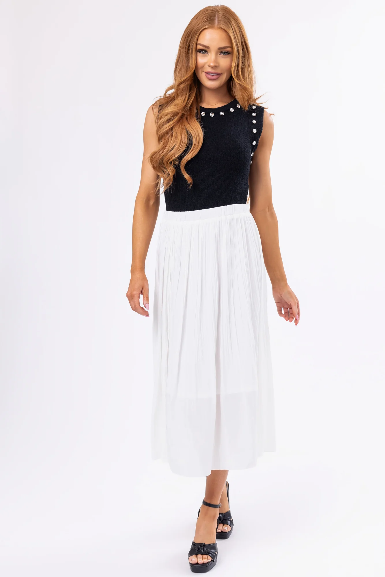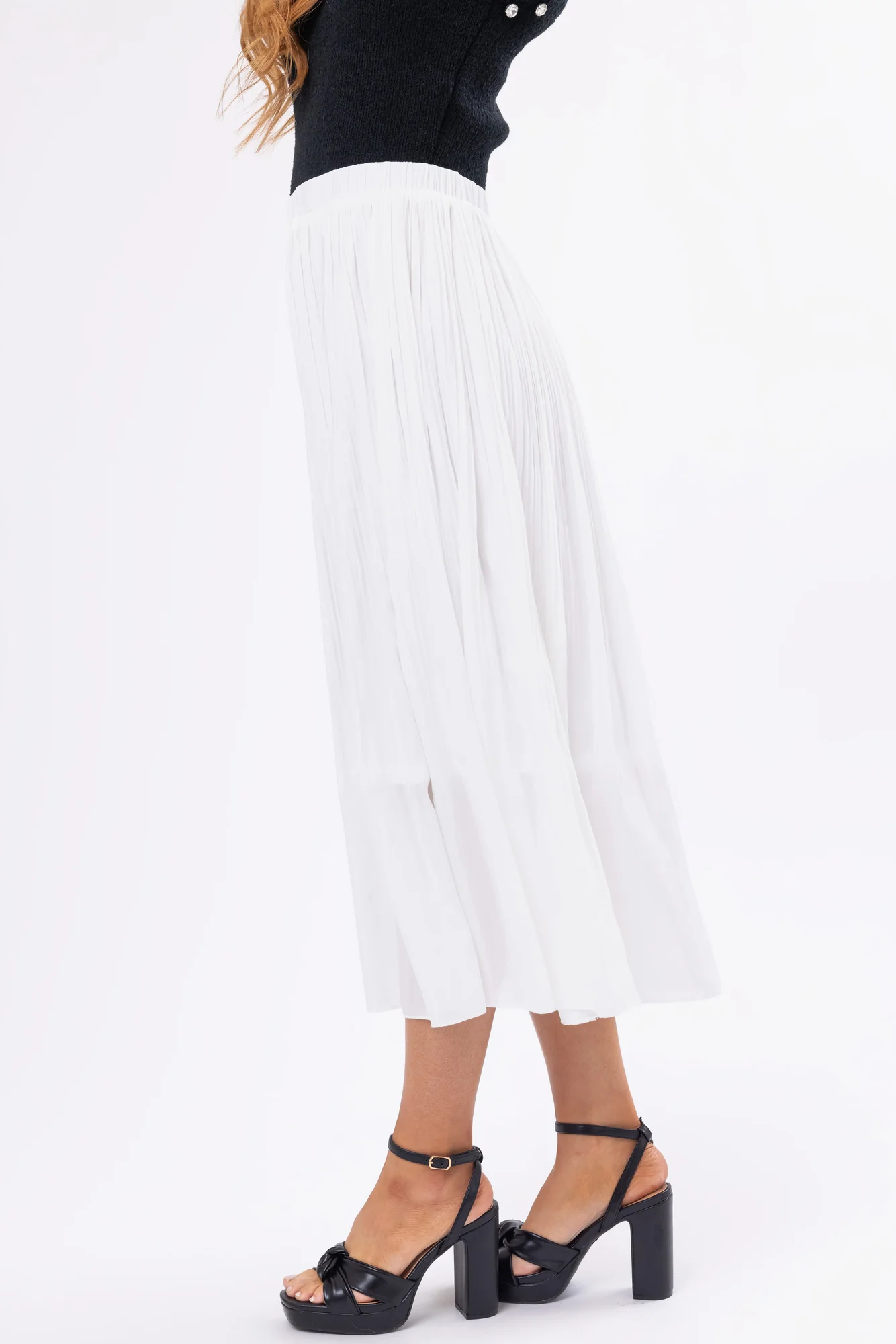 Add elegance to your wardrobe with our White Pleated Midi Skirt featuring a comfortable elastic waistband. Made of non-stretchy woven fabric with a soft lining, this skirt is perfect for any occasion. Available in sizes S, M, and L. Length options: 31″, 32″, 33″. Care instructions: Gentle wash cold, hang to dry. Model height: 55″, wearing size Small.