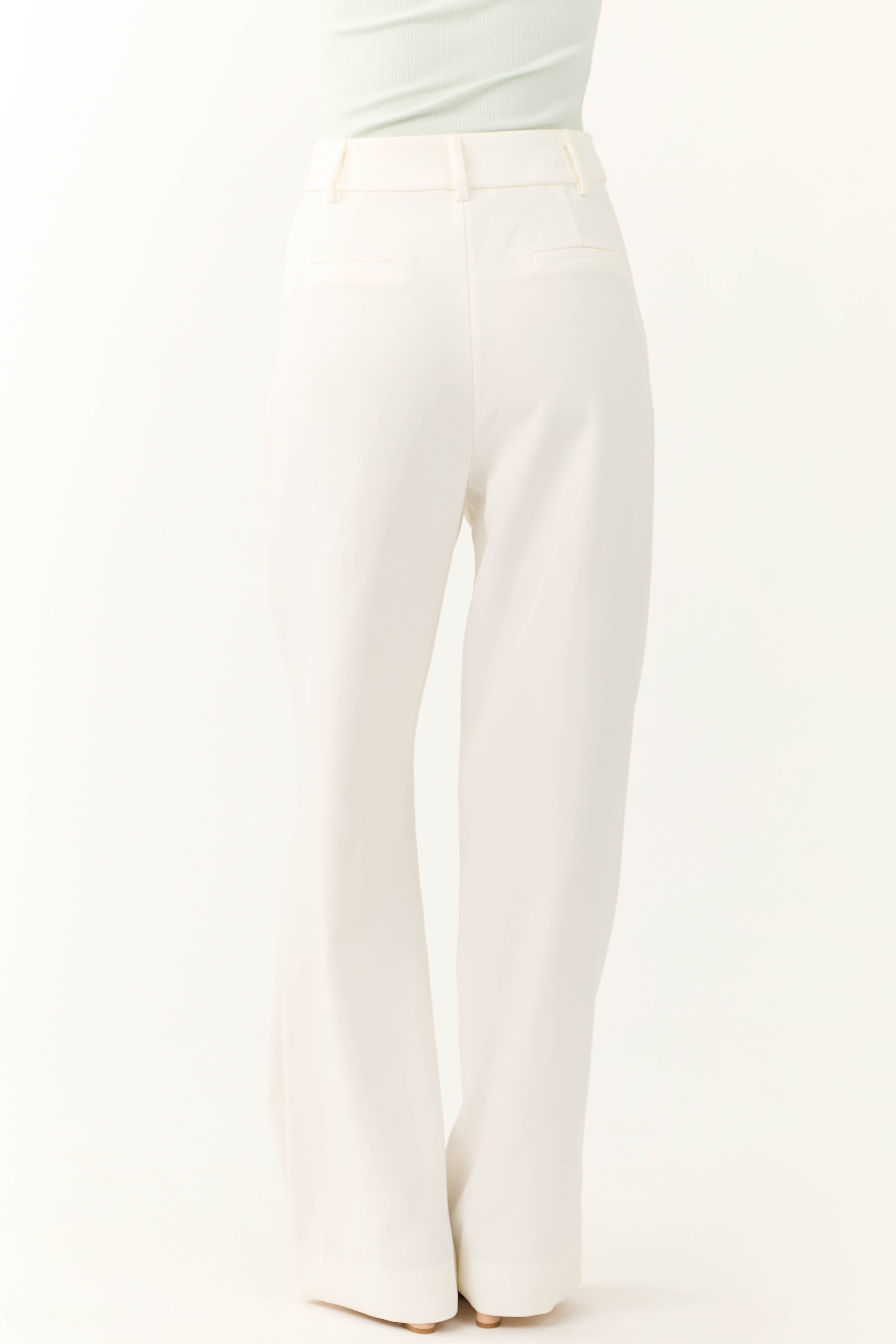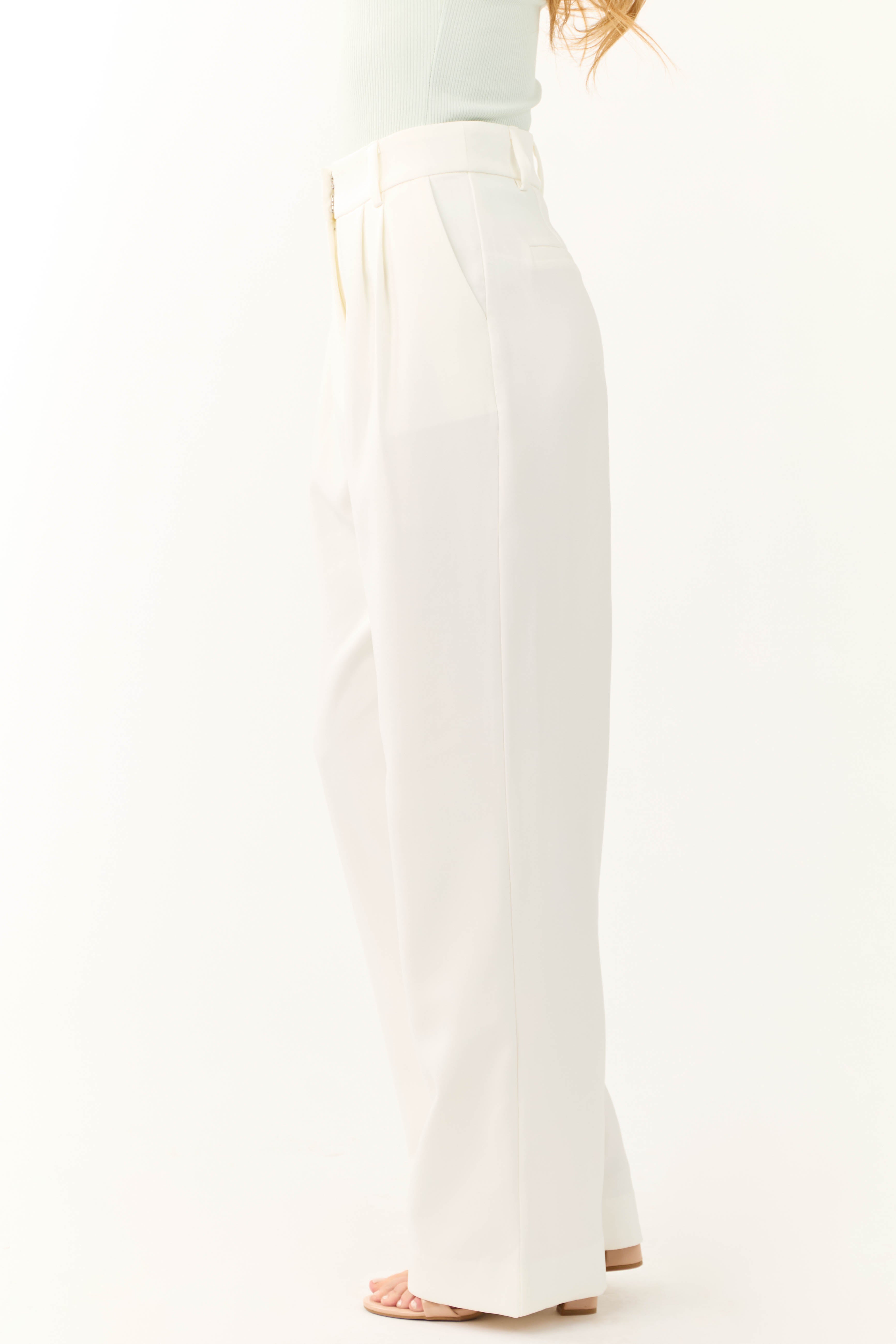 Discover comfort and style with our Off White Pleated High Waist Trouser Pants . These non-stretchy woven pants feature a wide-leg design, belt loops, and a zippered fly. Stay fashionable with decorative back pockets and be practical with functional front pockets. Hand wash in cold water and line dry for best care. Perfect for casual or work occasions, these pants are made of 95% polyester and 5% spandex with a 100% cotton lining. Elevate your look with these imported high-waisted pants available in sizes Small, Medium, Large. Models Profile: Size 1, Height 55″, Bust 31″ Waist 24″.