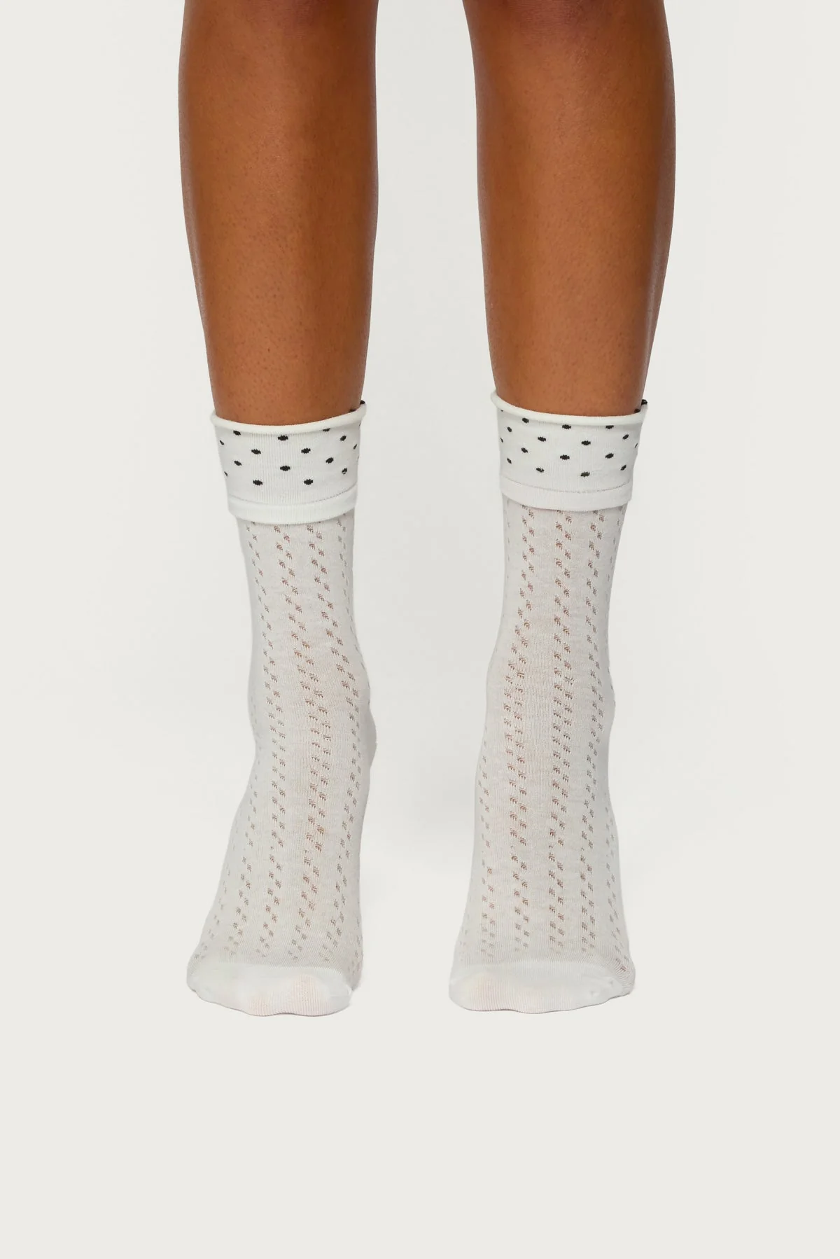 Indulge your feet with these white Pointelle polka dot socks made from a blend of cotton, polyester, and spandex. The intricate Pointelle fabric offers both style and breathability. These socks, measuring 12.2 inches in length, ensure a comfortable fit. Care instructions: Wash with similar colors for long-lasting color vibrancy and quality.