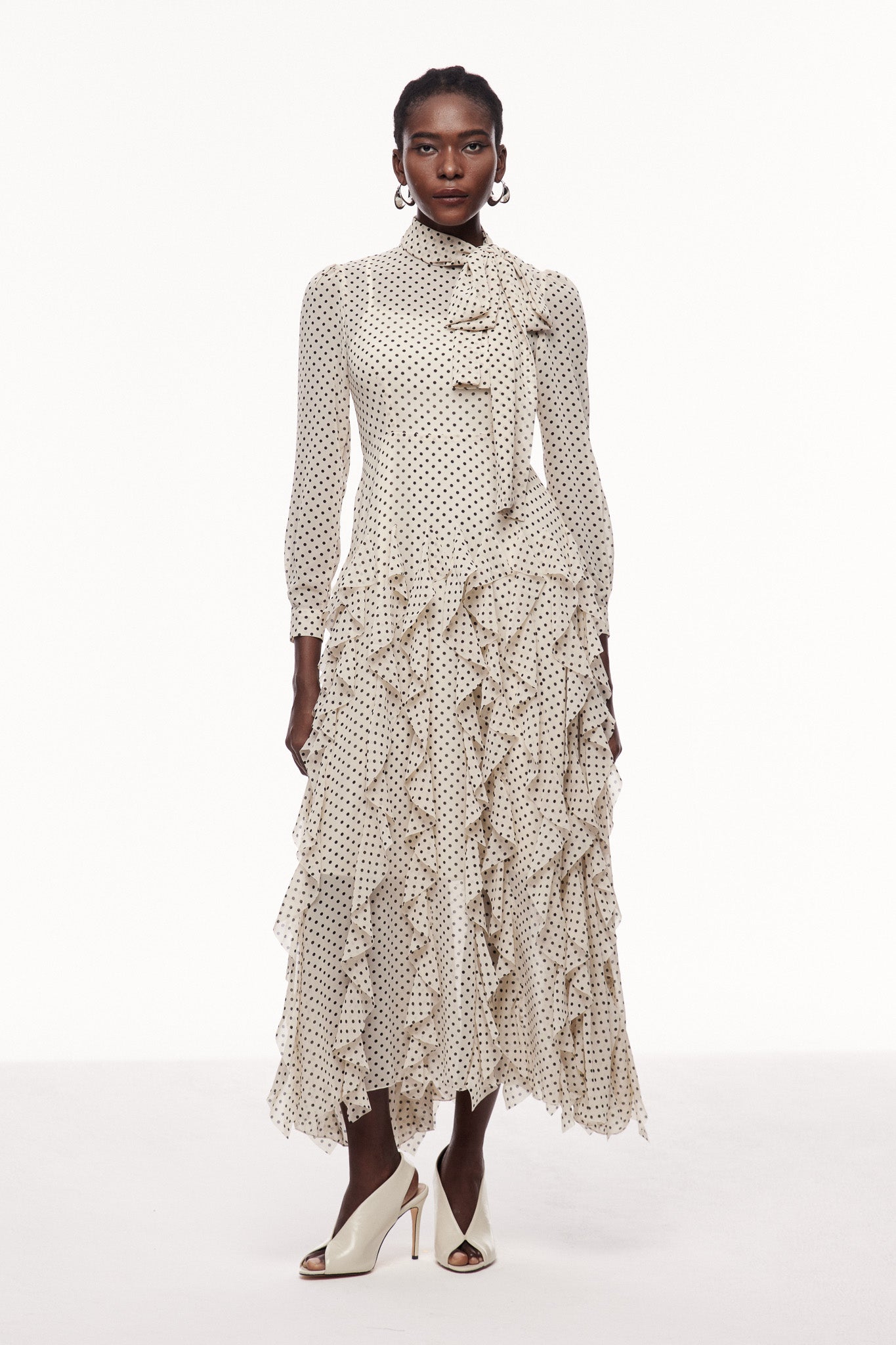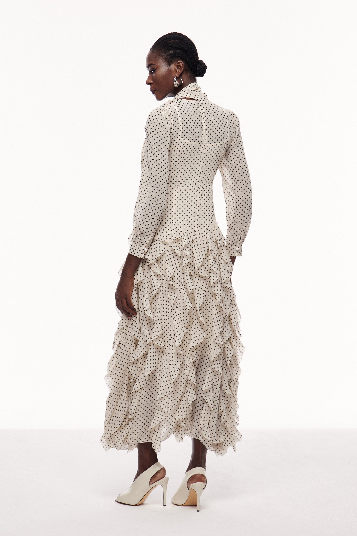 Elevate your style with our White Polka Dot Bow Ruffle Maxi Dress. This stunning dress features a timeless polka dot pattern, a charming bow detail, and elegant cascading ruffles. Ideal for formal events or chic daytime affairs, this maxi dress offers a sophisticated and comfortable silhouette. Expertly crafted for graceful movement and a refined look, this dress is a must-have in every fashion-forward wardrobe. Look and feel amazing in this exquisite piece. Color variation may occur due to lighting in images.