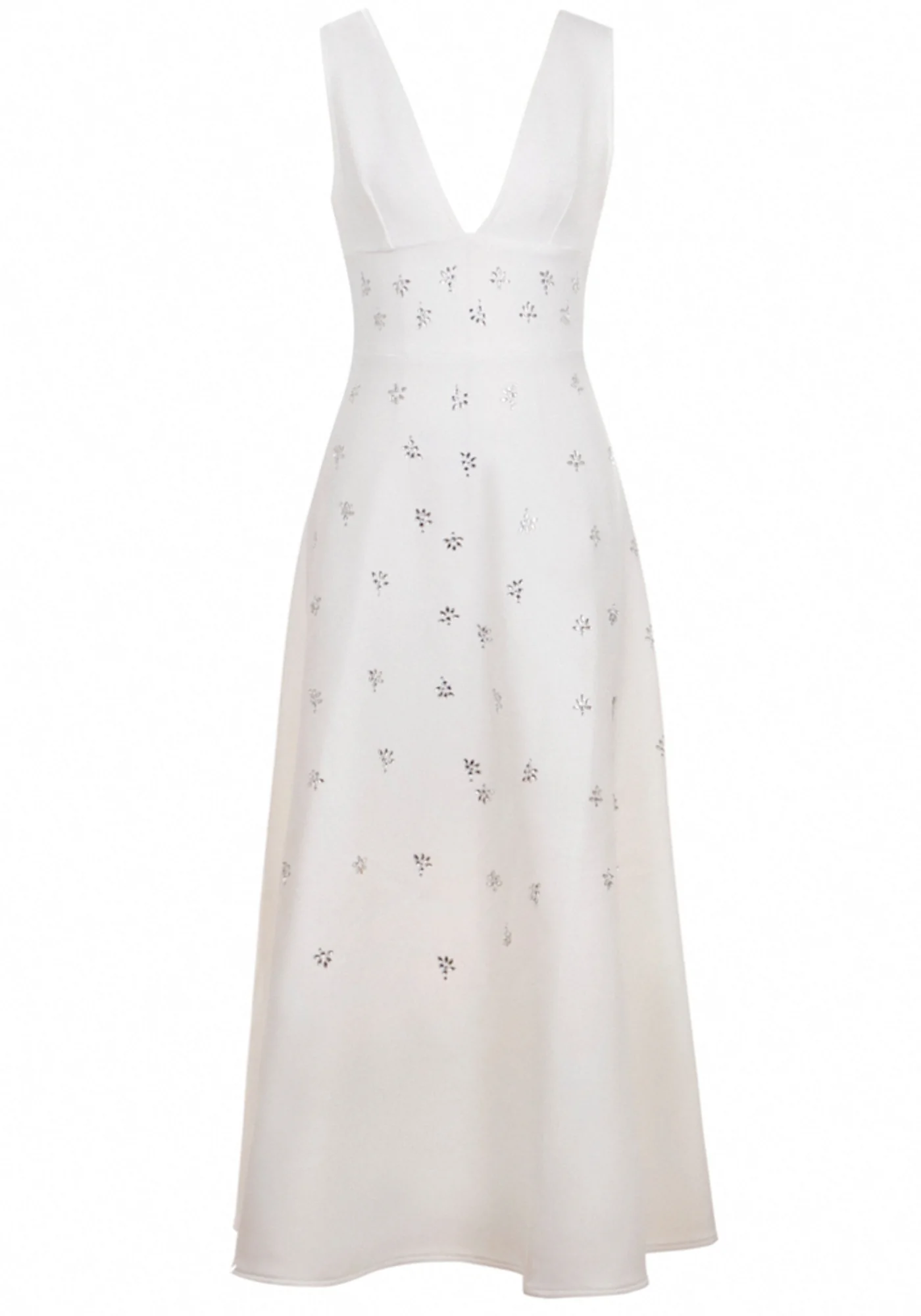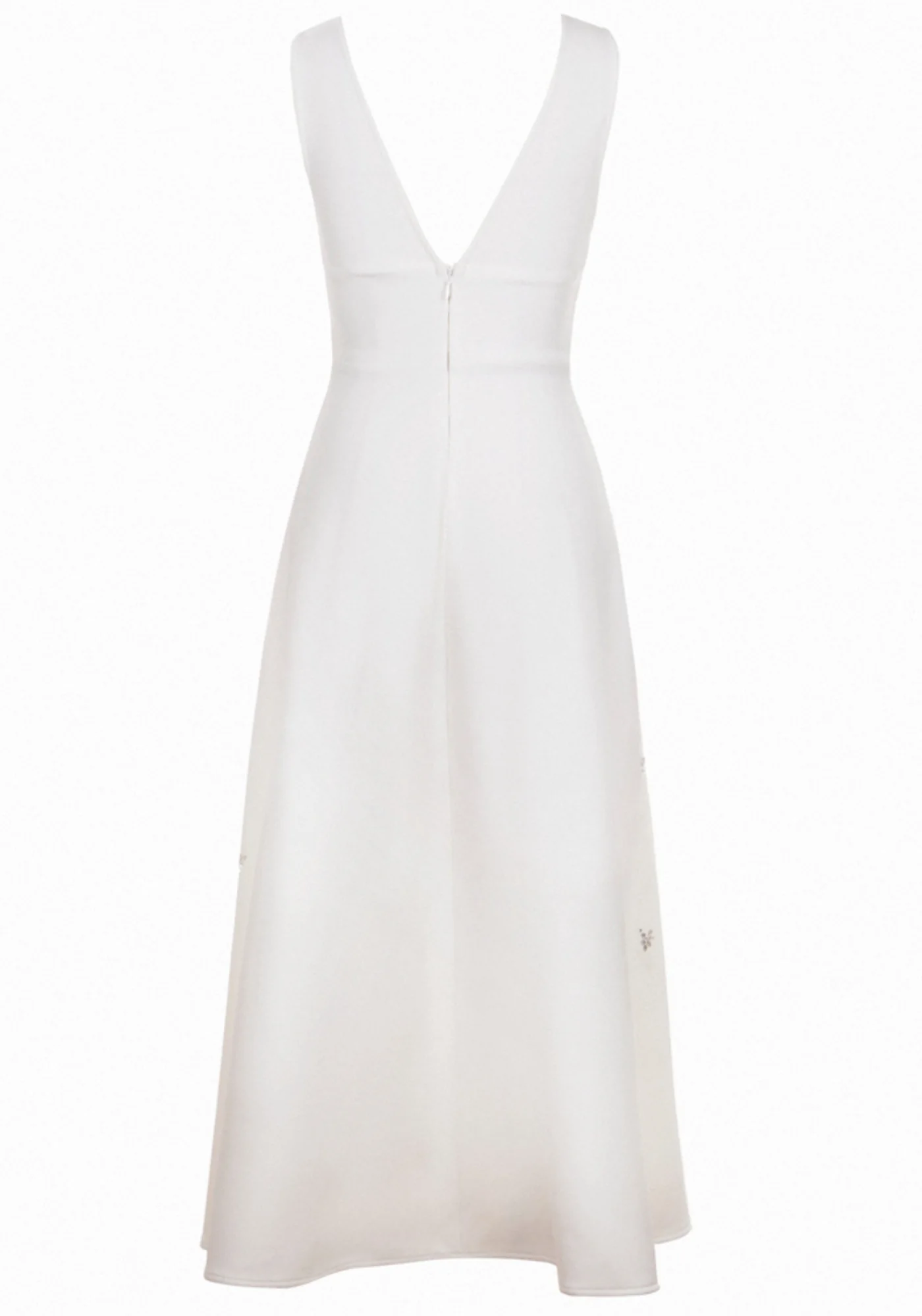 This White Rhinestone Embellished A-Line Midi Dress features a V-neck, sleeveless design accentuated with dazzling rhinestones. Made of high-quality polyester and cotton blend for lasting elegance. Concealed back zipper for a seamless look. Suitable for various occasions, the mid-calf length adds a touch of sophistication to your wardrobe. Carefully crafted with YKK zipper for durability. Illuminate your style with this exquisite dress and make heads turn wherever you go.