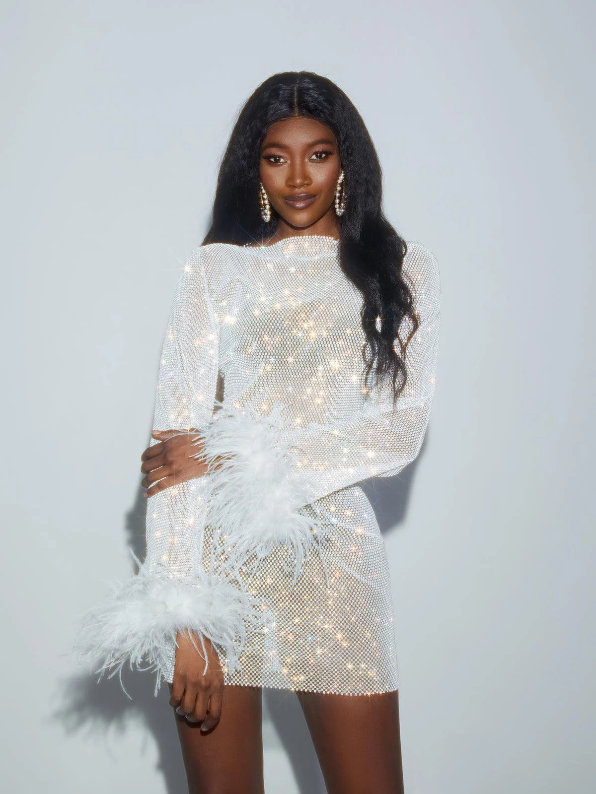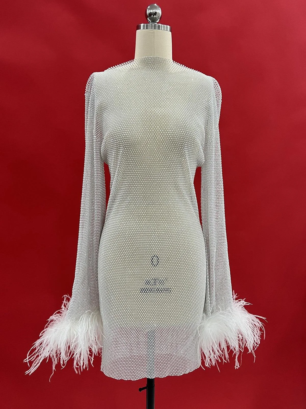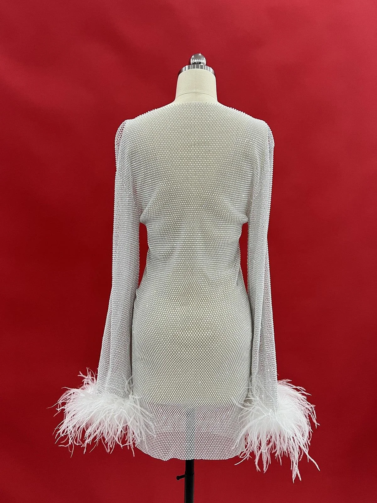 Make a bold statement in the White Rhinestone Mesh Bodycon Mini Dress. This figure-hugging mini dress is intricately embellished with rhinestones and luxurious feather trims. Crafted from stretchy sheer mesh for a high stretch factor, this dress is perfect for parties. Please dry clean only to maintain the exquisite quality. Note: Some feathers may shed due to the delicate nature of the material. Color variations may occur due to lighting. Get ready to stand out in this stunning dress!