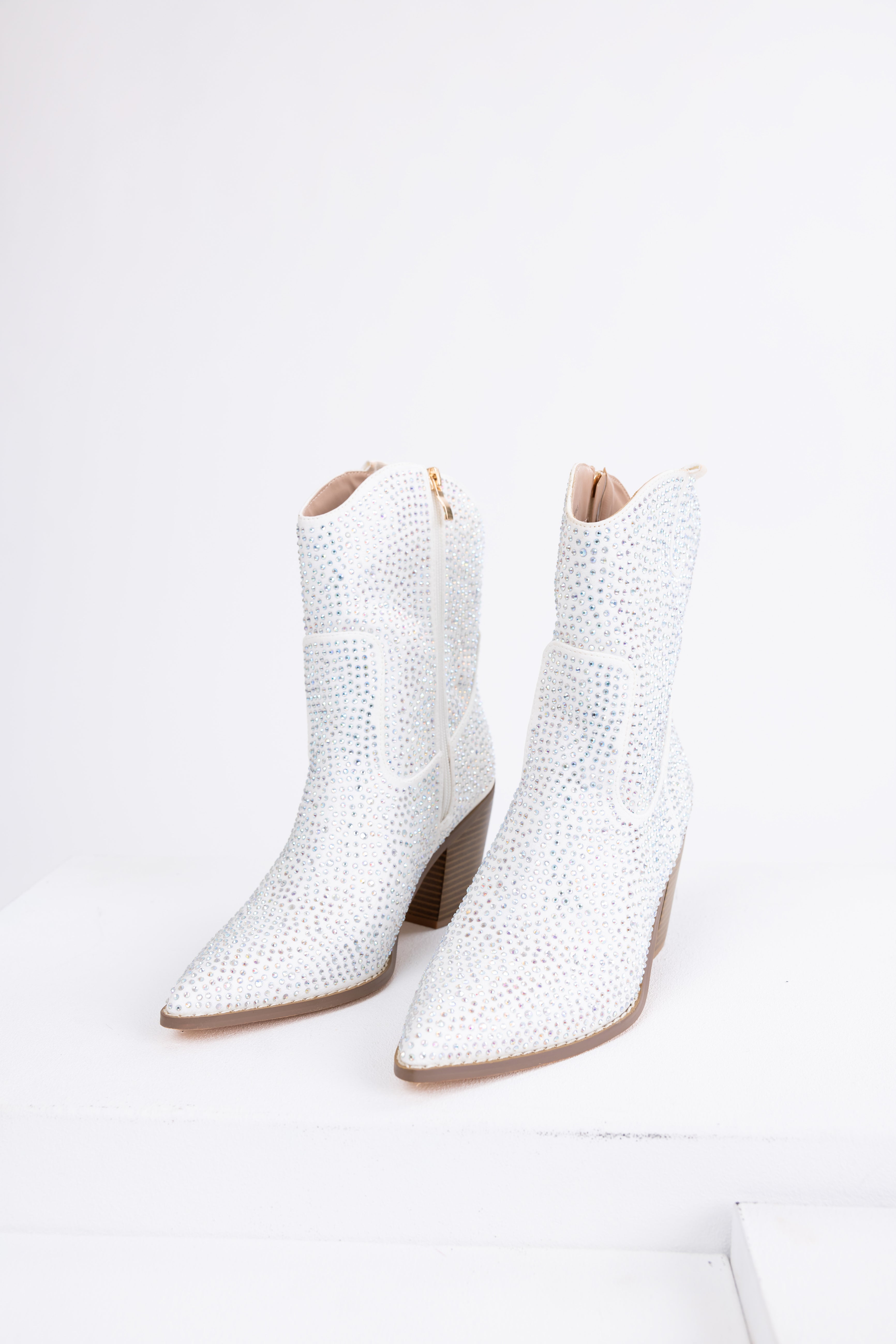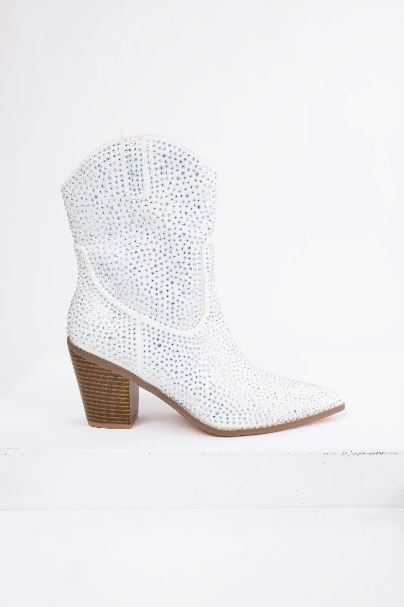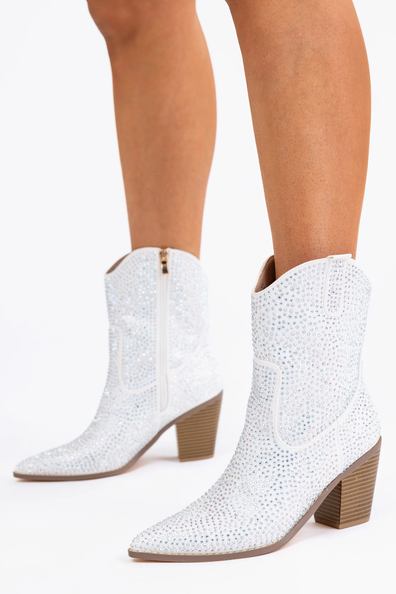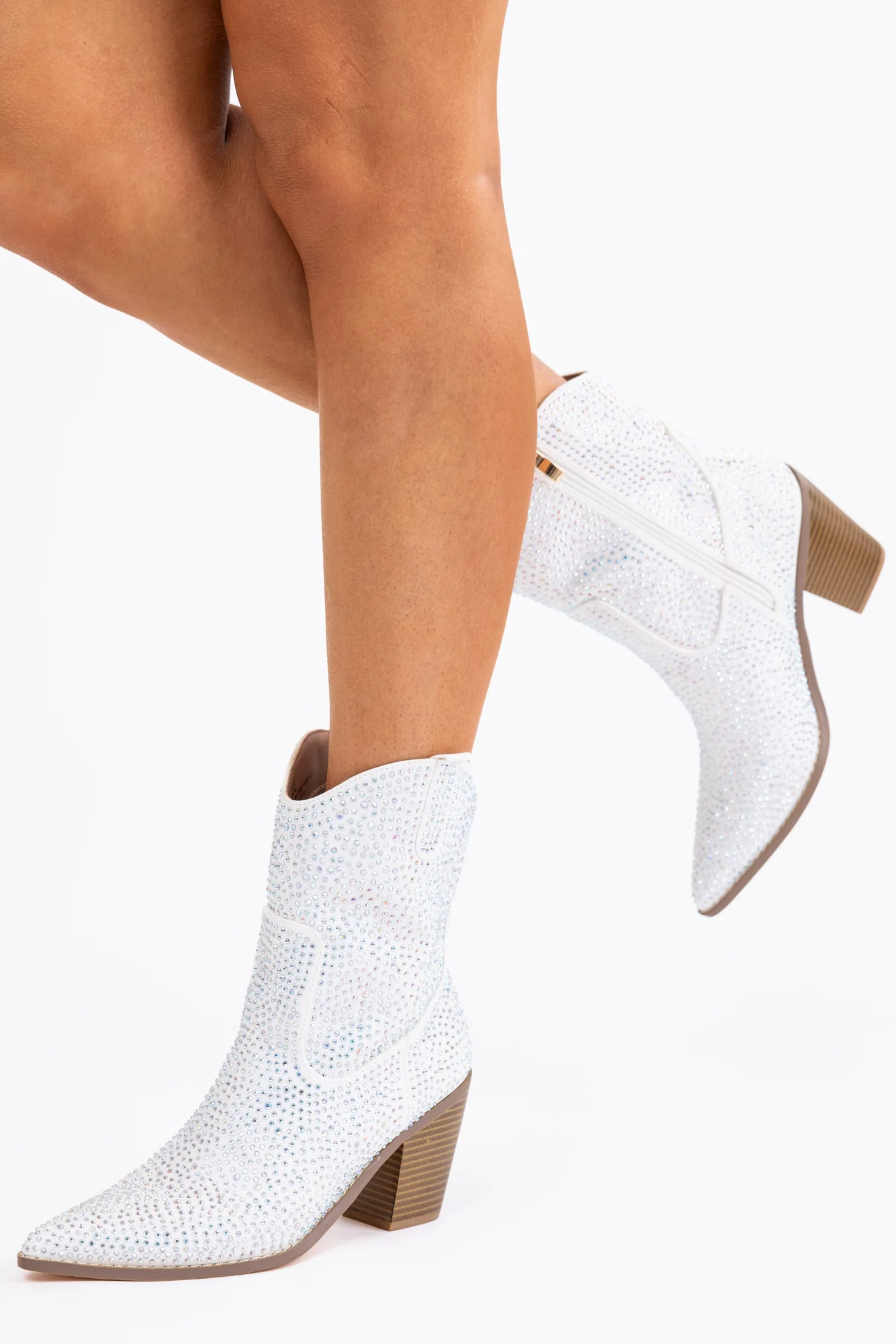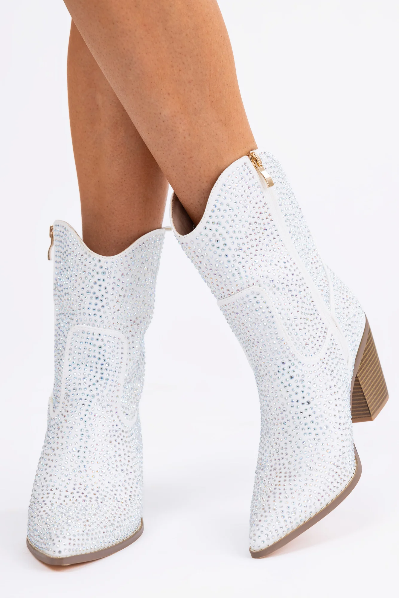 Step out in style with these amazing White Rhinestone Pointed Toe Ankle Boots . The iridescent rhinestones add a touch of glamour to these boots, while the stacked block heel provides both height and stability. Featuring a rubber sole, lightly cushioned insole, side zipper closure, and a curved opening, these boots are as comfortable as they are fashionable. The shaft measures 9 inches, the circumference is 13 inches, and the heel height is 3.5 inches. Perfect for date nights or daytime outings in the spring and summer. Feel confident and fashionable every step of the way. This product is measured based on size 8.