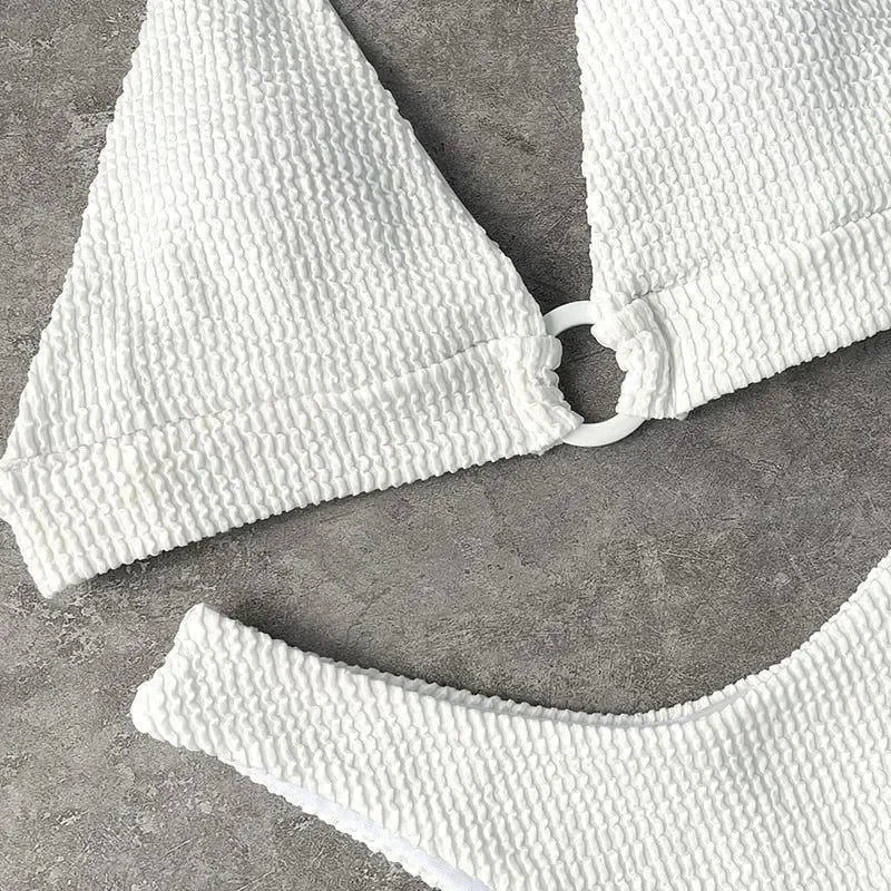 Elevate your swimwear collection with our White Ribbed Halter Bikini featuring a trendy ring-linked halter top. Enjoy both style and comfort with the ribbed texture, adjustable straps for a perfect fit, and quality polyester and Lycra fabric ensuring durability and all-day comfort. Stand out at the beach with this eye-catching bikini that provides wire-free support and padded cups for extra confidence. Explore more beach style inspiration on Instagram @mermaid_way. Make a statement and flaunt your best beach style effortlessly. Complimentary size exchanges available.