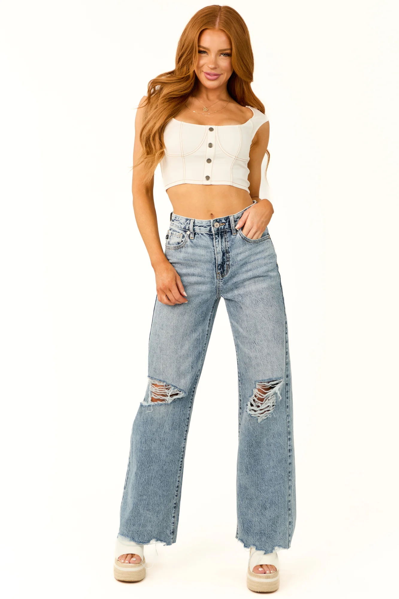 Elevate your wardrobe with our stylish White Ribbed Knit Cap Sleeve Crop Top . This trendy top features a faux button-down design, versatile cap sleeves, and a flattering cropped length. Made from a stretchy blend of 65% Rayon, 30% Nylon, and 5% Spandex, it offers both comfort and style. The seam details in a subtle spice shade add a unique touch. Pair it effortlessly with our Ivory Zip Up Ruffle Seam Details Mini Skirt for a chic ensemble. This top is perfect for daytime outings or date nights. Care instructions: Dry clean only. Model is wearing a size Small – Size 1, Height 55″, Bust 31″, Waist 24″.