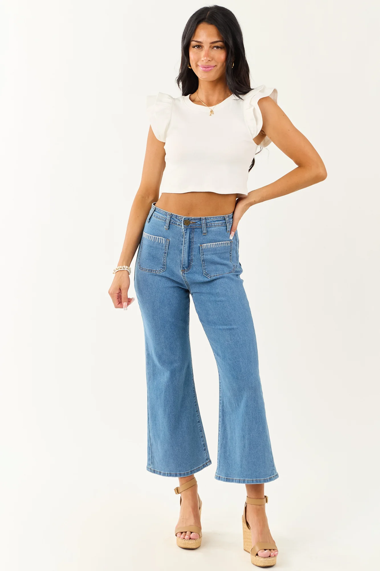 Indulge in flirty sweetness with our White Ribbed Knit Crop Top. Crafted from a stretchy cotton blend, it features layered ruffle sleeves for a playful touch. This cropped top is a versatile addition to your wardrobe, perfect for casual outings or dressed-up occasions. Available in sizes S, M, and L. Model is wearing size Small and is 59″ tall with a 34″ bust and 26″ waist.