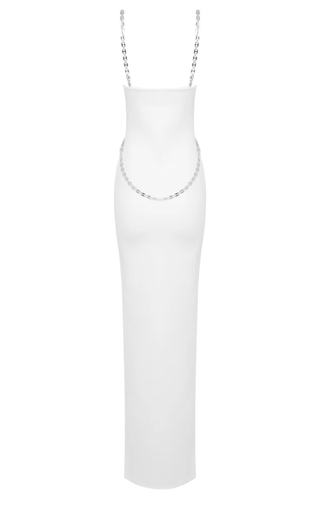 The White Ribbed Knit Maxi Dress with Chain Detailing is a chic and versatile piece that offers both style and comfort. This dress features silver-tone chain detailing at the waist, along with silver-tone metal tab shoulder straps for a modern touch. Made from ribbed knit fabric, it is unlined and designed with a scoop neck and side seam split for ease of movement. Perfect for any occasion, this dress exudes effortless elegance and contemporary flair.