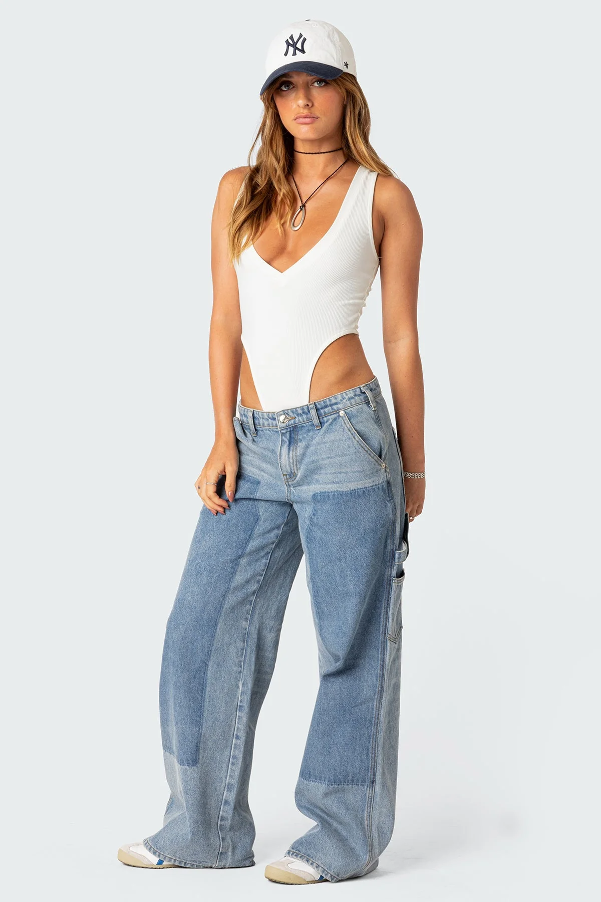 Indulge in the chic and trendy White Ribbed V Neck Bodysuit embodying a high cut design for a modern flair. Crafted from a blend of Polyester and Spandex, this piece offers both style and comfort. Whether youre out shopping or meeting friends, this bodysuit exudes elegance. Available in multiple sizes. Elevate your wardrobe with this must-have! Care Instructions: Machine wash cold with like colors.