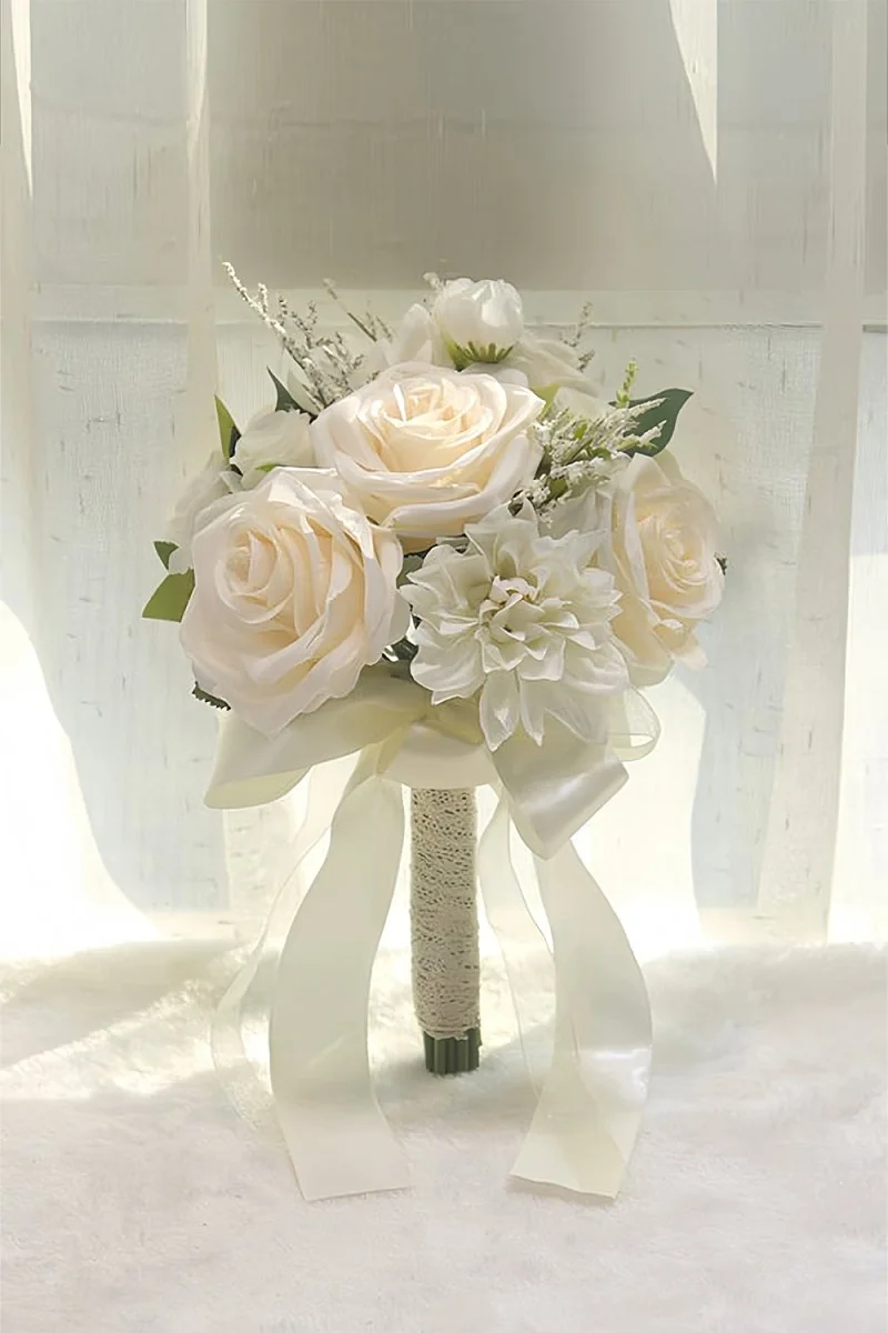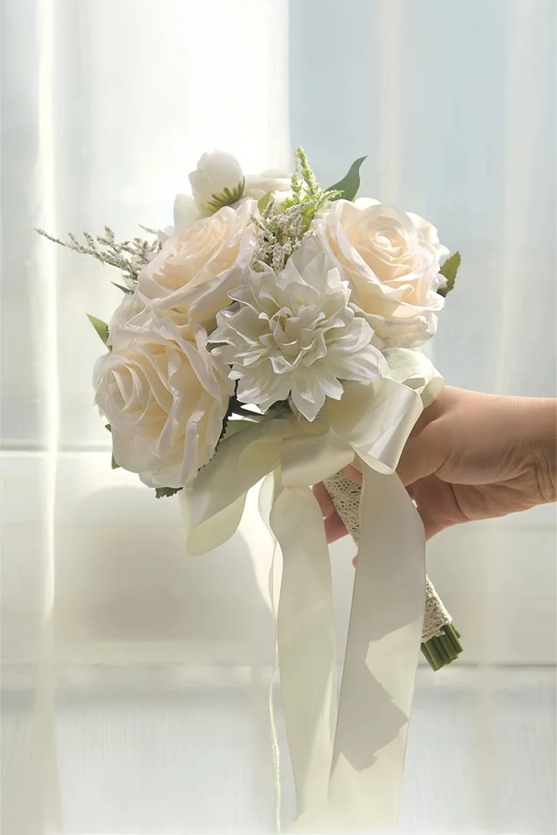 Embrace the elegance of this cascade bouquet featuring lifelike white roses and hydrangeas, artfully designed for a soft, romantic appearance. Ideal for weddings, bridal portraits, or as a cherished keepsake, it adds timeless charm to any bridal outfit. Bring your fairytale wedding to life with this gorgeous silk bouquet. Made from high-quality silk, this bouquet includes lifelike roses and hydrangeas. The elegant cascading shape measures 23 cm in length with a diameter of 20 cm.