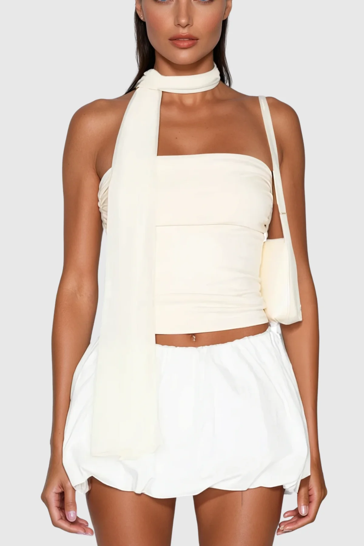 Experience the sleek and modern silhouette of our White Ruch Strapless Top, featuring gathered ruching that enhances shape and texture. This top boasts a clean neckline for layering, crafted for a secure fit without straps. Versatile for casual or dressy occasions, it balances style and comfort effortlessly. Enjoy slight stretch and easy care in gentle machine wash. Note: Color may vary due to lighting. Discover the perfect blend of style and comfort today!