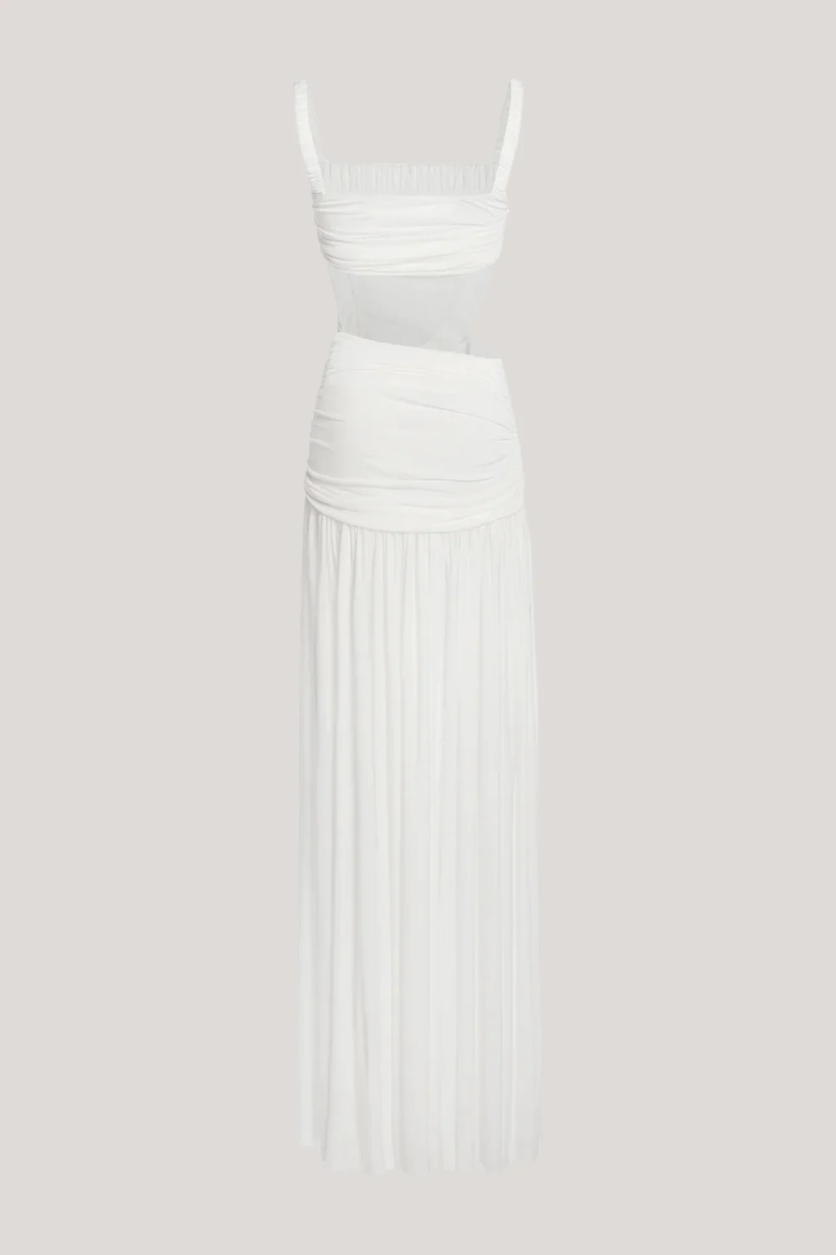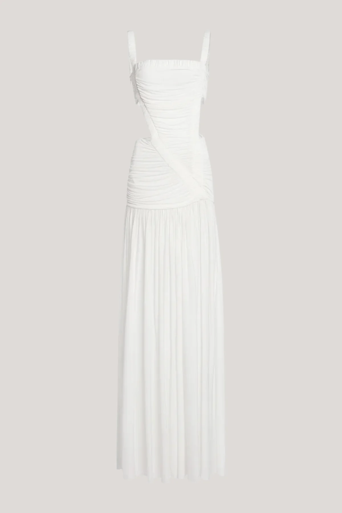 The White Ruched Cutout Maxi Dress offers a blend of elegance and modernity with its sophisticated ruching and strategically placed cutouts. Designed to enhance your silhouette, this dress strikes a perfect balance between coverage and allure, perfect for upscale events or evenings. Youll exude confidence with its emphasis on comfort and style, ensuring a polished look throughout your wear. Experience slight stretch for added comfort. Care: Machine wash gently. Please note, color may vary in images due to lighting conditions.