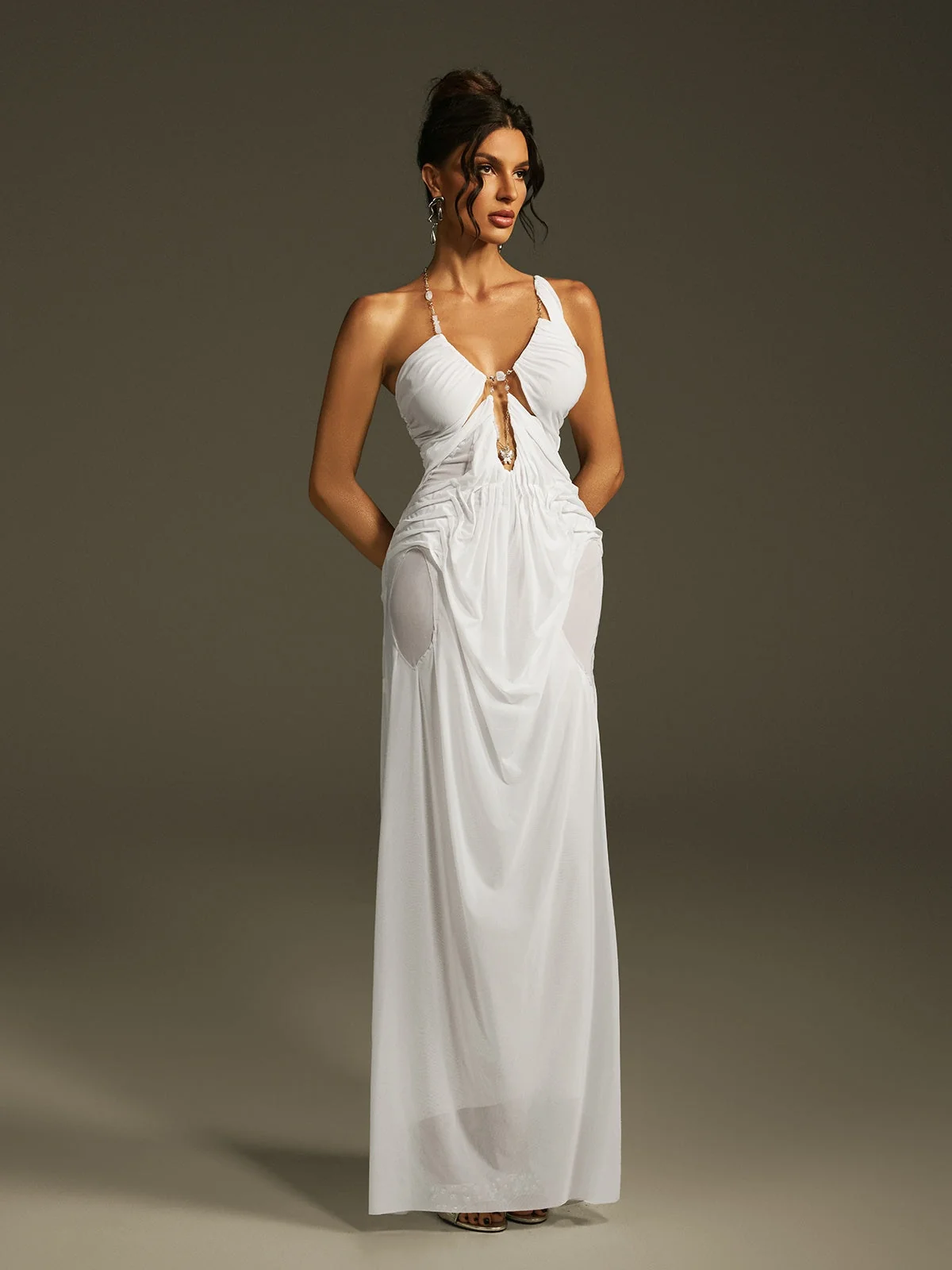 Step into the spotlight with our stunning White Ruched Halterneck Maxi Dress that accentuates your figure beautifully. This wetlook dress features a figure-hugging silhouette, an elegant halterneck design, and a slight stretch for comfort. Perfect for special occasions, this dress is a true head-turner that guarantees to make you stand out in the crowd. Crafted from 100% Polyester. Dry clean only. Please note, actual color may vary due to lighting. Model showcased in size S.