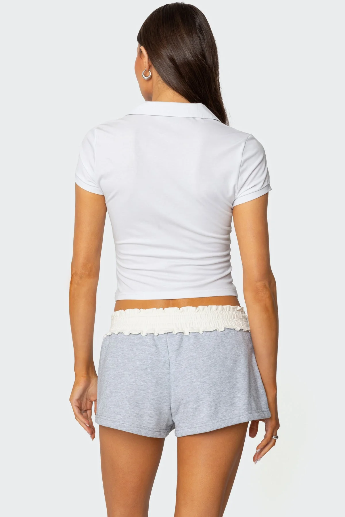 Upgrade your wardrobe with this versatile White Polo Top featuring underbust stitching and ruched detailing. Made from a blend of Rayon, Nylon, and Spandex, this top offers comfort and style. The model is wearing size S and is 59 tall. This item is machine washable (max 30ºC), do not bleach, tumble dry, iron at a max of 110ºC, and avoid dry cleaning.
