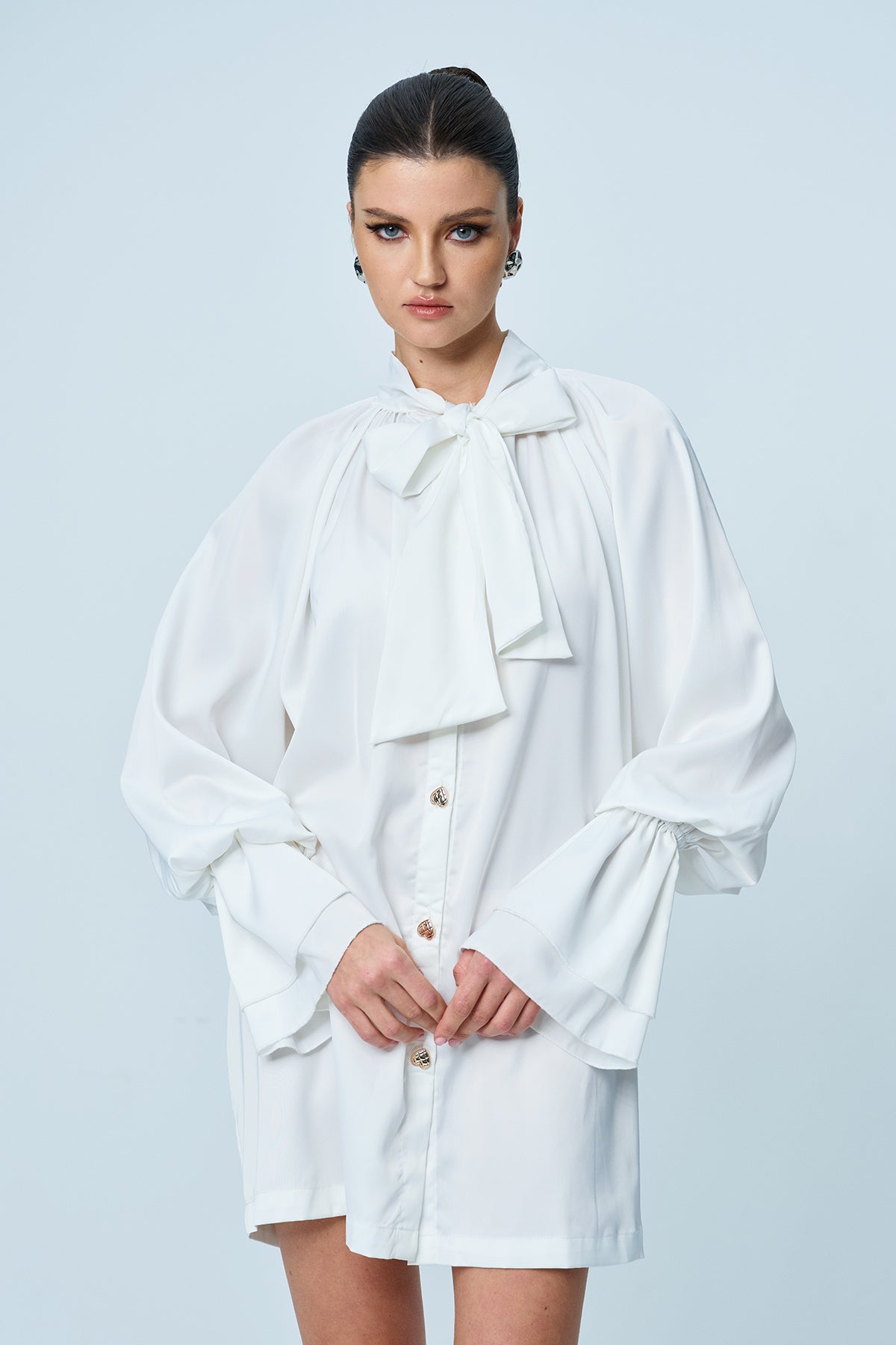 Elevate your style with our White Ruffle Bow Lace Up Shirt. This chic and stylish design features intricate lace details, a flattering ruffled design, and a touch of modernity with the lace-up feature. Perfect for any occasion, this shirt is a must-have wardrobe piece offering a blend of elegance and comfort. Material: 50% Polyester, 50% Cotton. Stretch Factor: Non-Stretch. Care Instructions: Gentle machine wash. Note: Color may vary due to lighting. Actual product color closest to images shown.