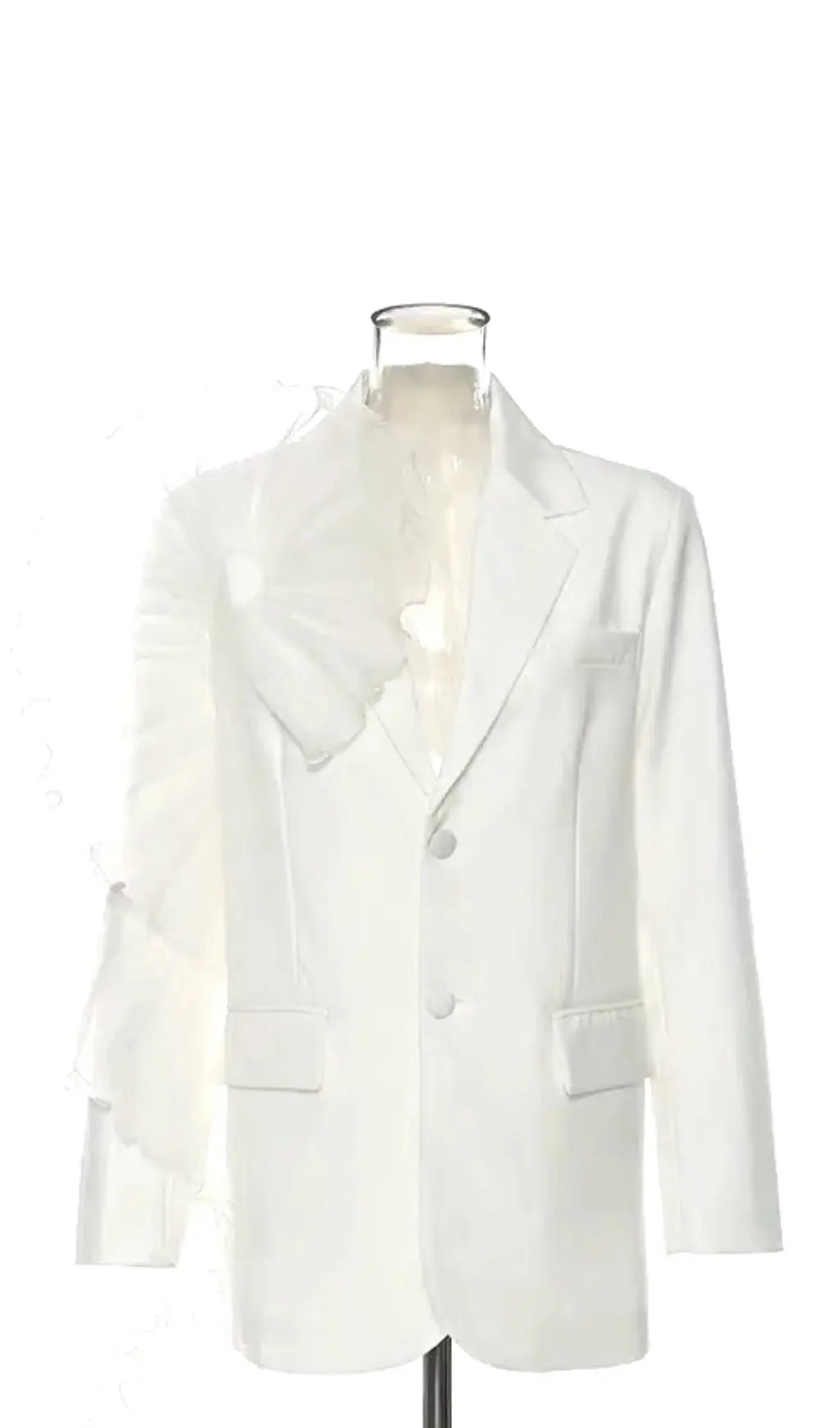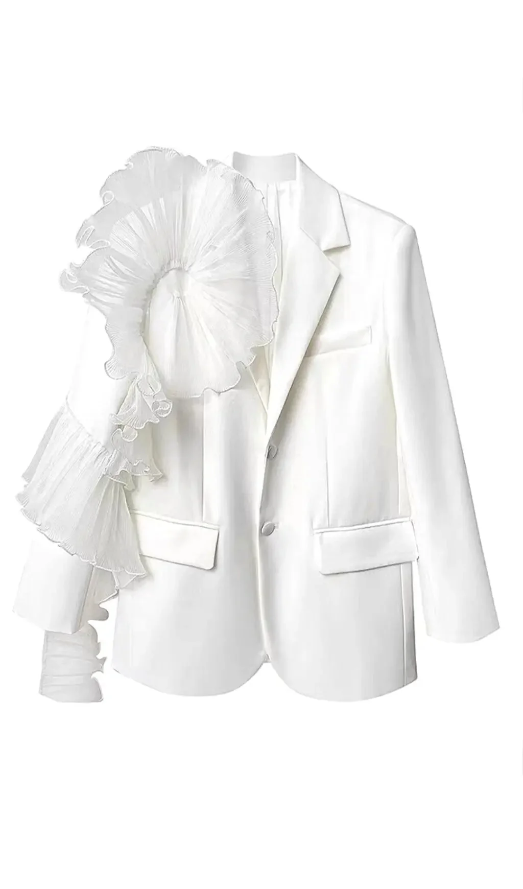 Embrace elegance with our White Ruffle Detail Blazer Dress crafted from high-quality polyester fabric for a luxurious touch. This long-sleeve dress features a stylish ruffle design, offers low stretch for optimal comfort, and is suitable for various occasions. Whether its a date night or a special event, this solid white attire is a must-have in your wardrobe. Hand wash cold, lay flat to dry, or opt for dry cleaning to maintain its pristine condition. Please consult our size chart for the perfect fit.