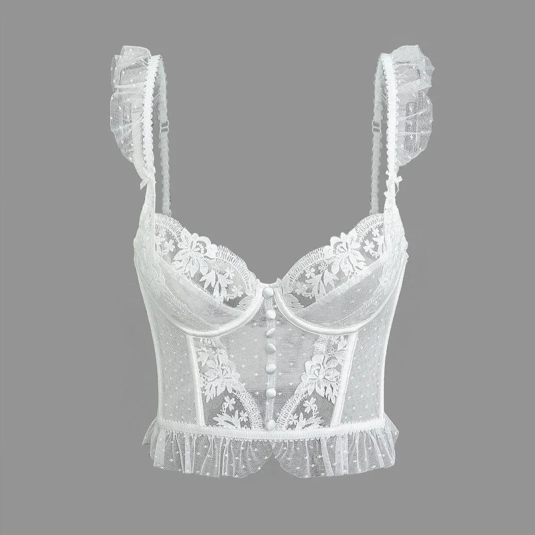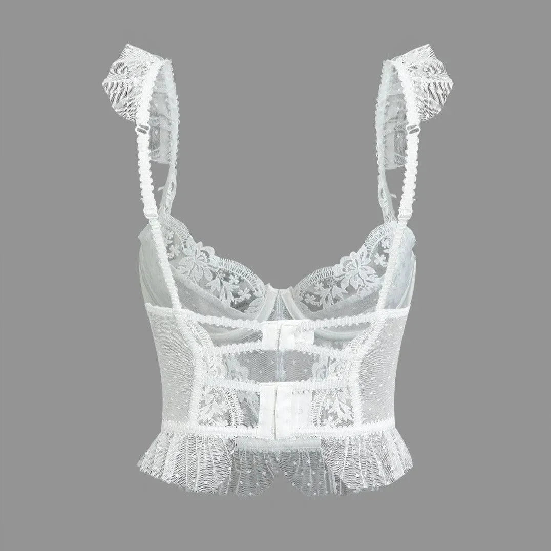 Elevate your wardrobe with this White Ruffle Lace Cami Crop Top, a perfect blend of elegance and charm. Featuring intricate lace detailing and playful ruffles, this crop top offers a feminine and stylish look. The lightweight fabric drapes beautifully, ensuring both comfort and sophistication. Ideal for layering or wearing on its own, it adds a chic touch to any outfit. Enhance your fashion collection with this piece that embodies effortless sophistication. Pair it seamlessly with high-waisted pants for a versatile transition from day to night. The delicate design complements a variety of styles, making it suitable for any occasion. Discover more style ideas and fashion inspiration by visiting our Instagram @mermaid_way. MATERIAL: 17% Elastane, 83% Polyamide. If your item doesn’t fit as expected, we’re happy to offer a complimentary exchange for a different size.