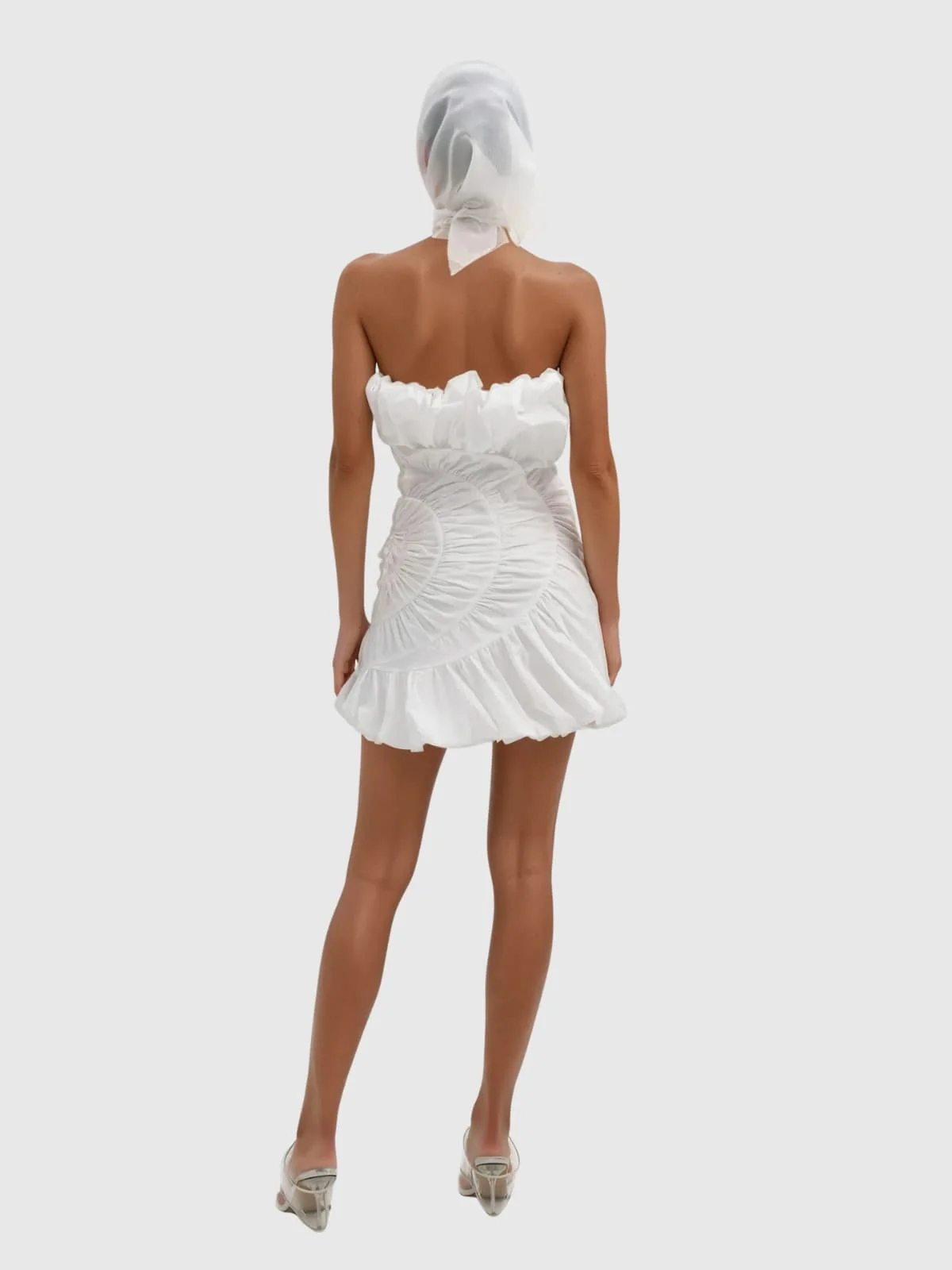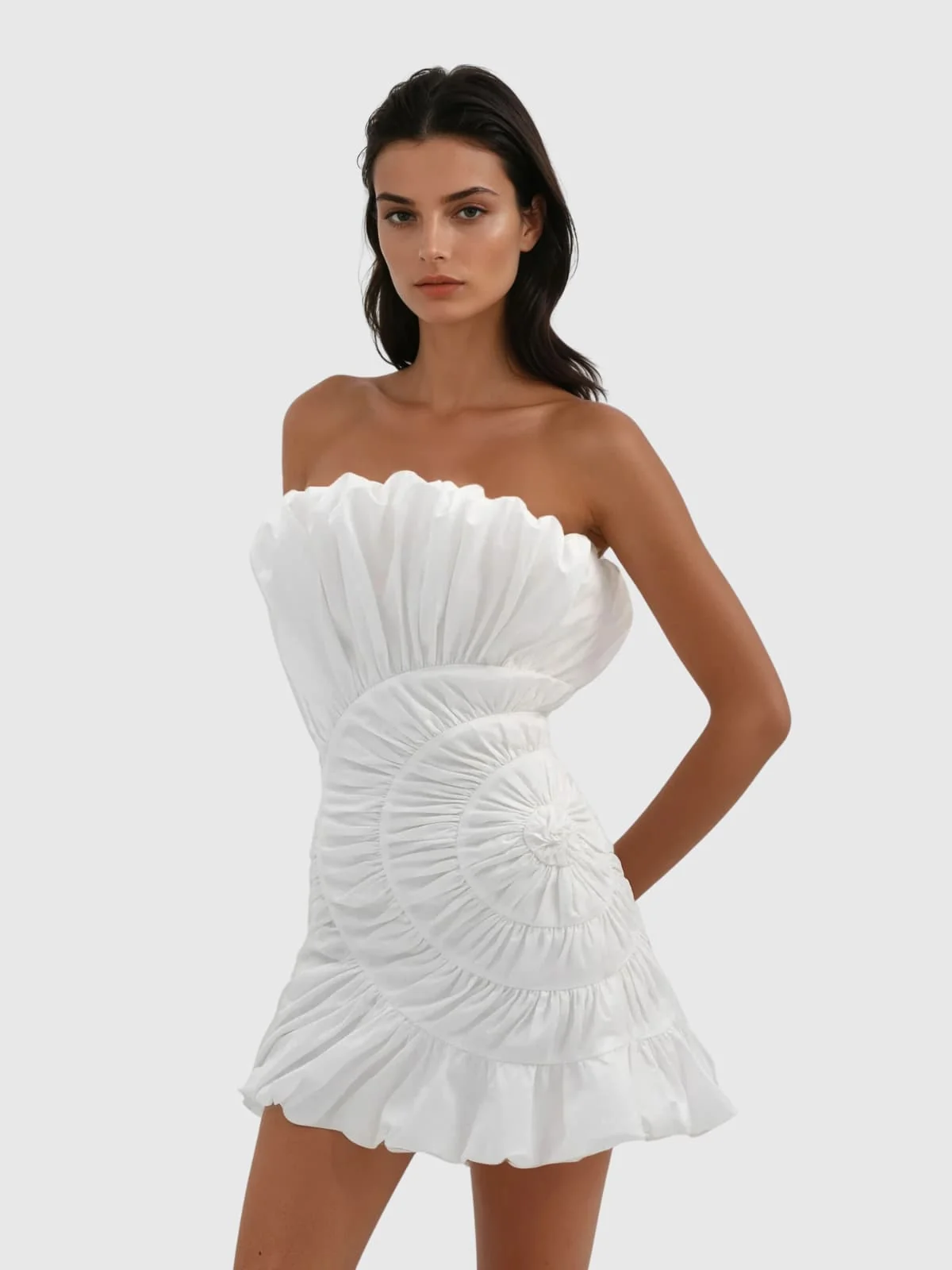 Elevate your style with the White Ruffle Mini Dress featuring a flattering ruched bodice and delicate ruffles for a playful touch. Ideal for parties and special occasions, this strapless dress offers a chic, feminine look perfect for showcasing confidence and grace. Made of 100% Polyester with slight stretch for comfort. Recommended for dry cleaning to maintain its elegance. Please note that the color may vary slightly due to lighting. Model featured is wearing size S.