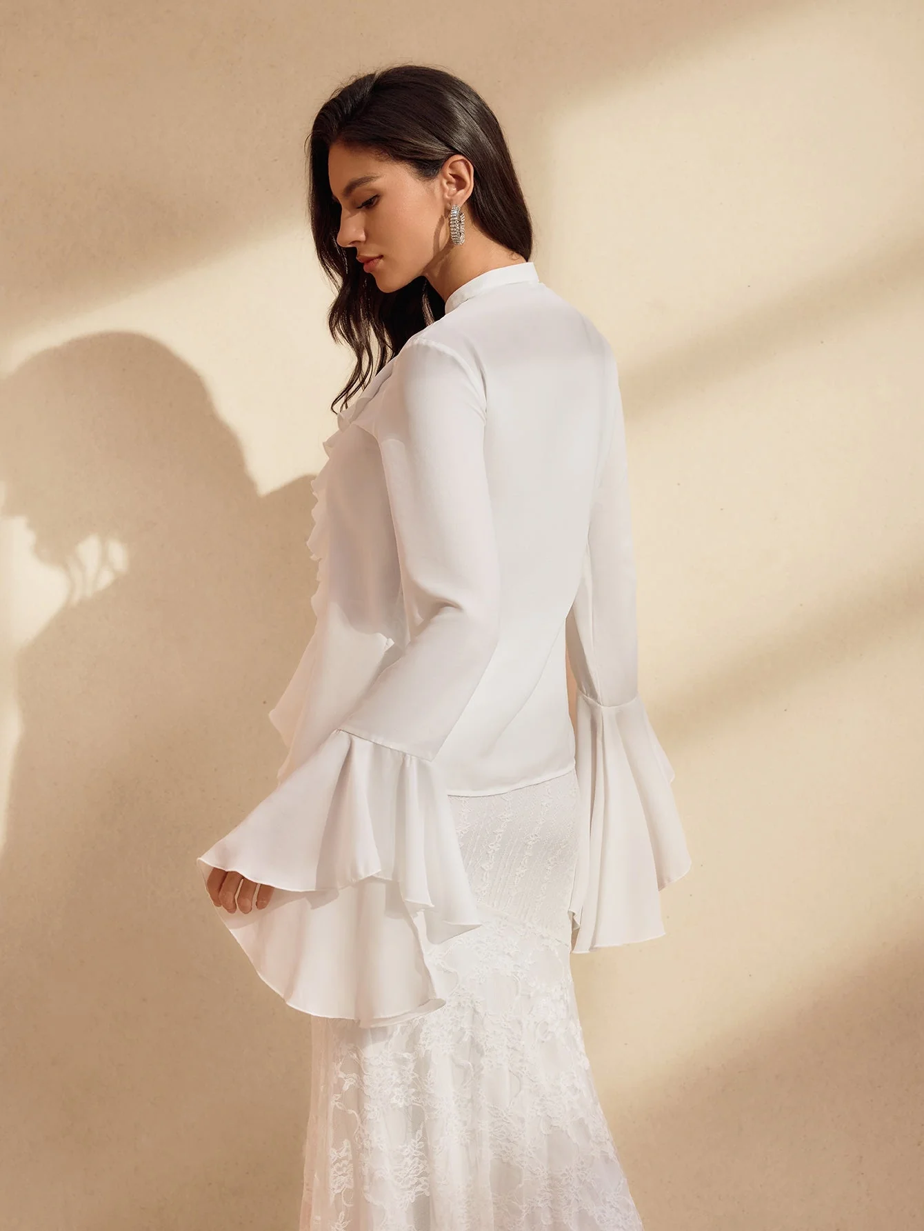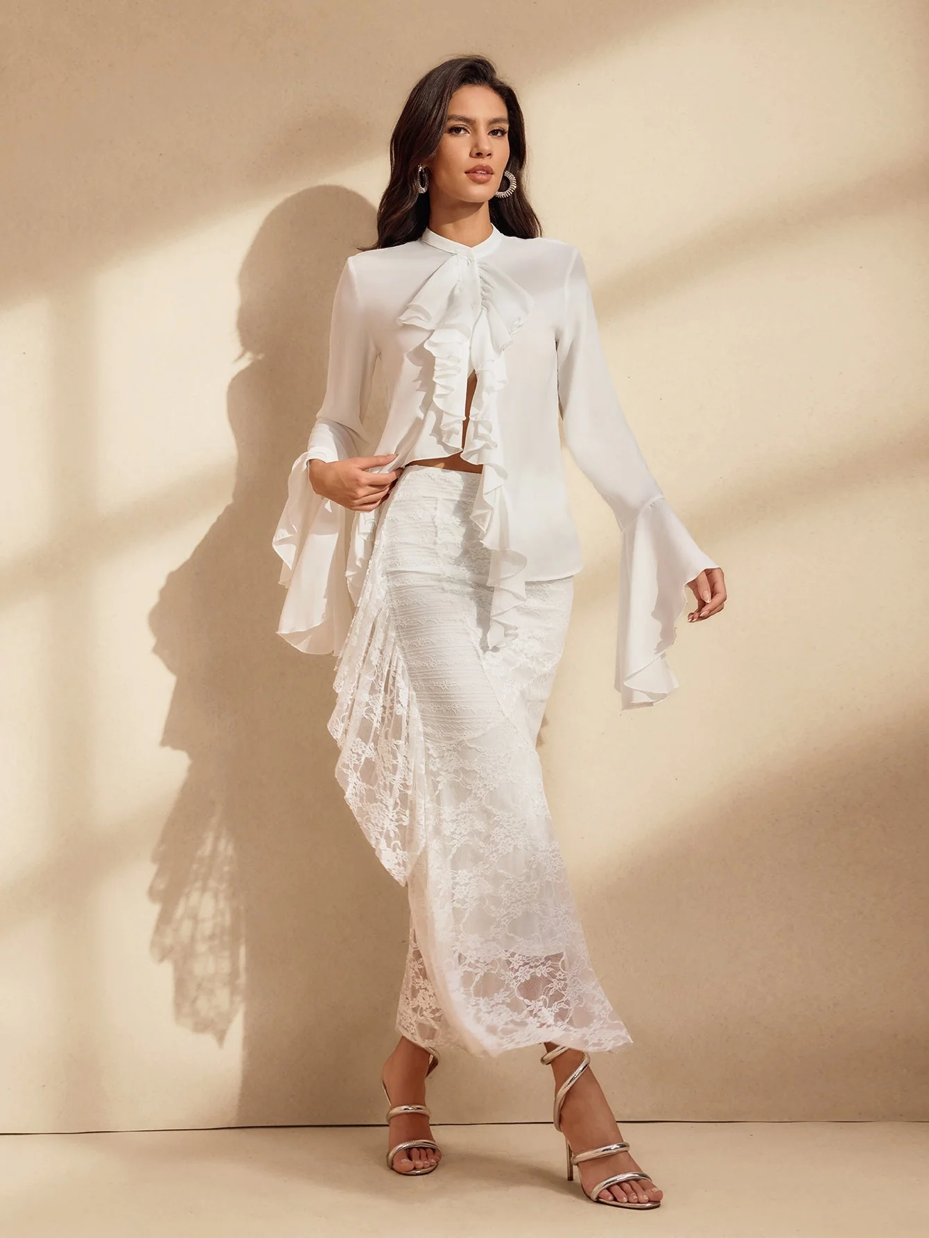 Elevate your wardrobe with this elegant White Ruffled Long Sleeve Top for a blend of sophistication and comfort. Delicate ruffle details add a feminine touch, while the versatile long sleeves suit any season. Ideal for both casual outings and formal events, this top elevates your style with subtle sophistication, offering a flattering fit that moves with you. Make it a must-have in your collection. Material: 100% Polyester with Slight Stretch. Care: Dry clean only. Actual color may vary from images due to lighting. Model is shown wearing size S.