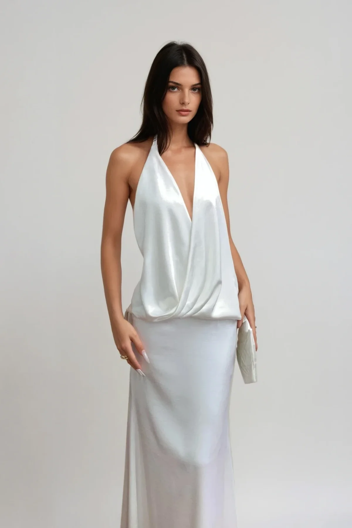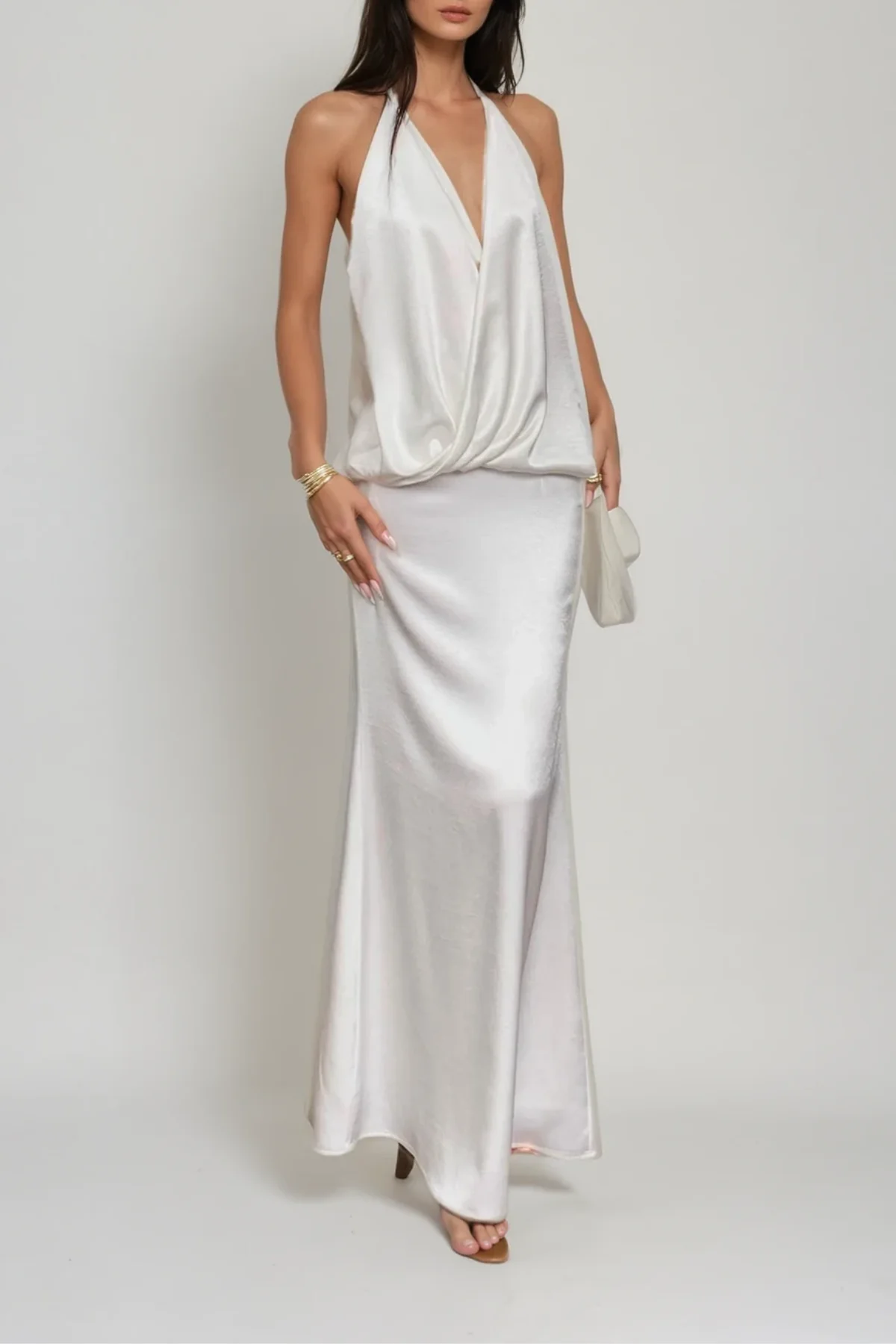 Indulge in the luxurious charm of the White Satin Backless Maxi Dress. This chic and timeless piece is crafted from silky satin fabric, offering a smooth and flattering silhouette. The backless design exudes modern allure while making a bold style statement. Ideal for formal occasions, this dress blends comfort with sophistication, creating an essential outfit for those seeking refined glamour. Experience non-stretch comfort. For care, gentle machine wash is recommended. Variations in color may occur due to lighting during photography.