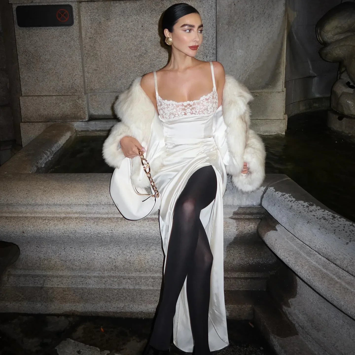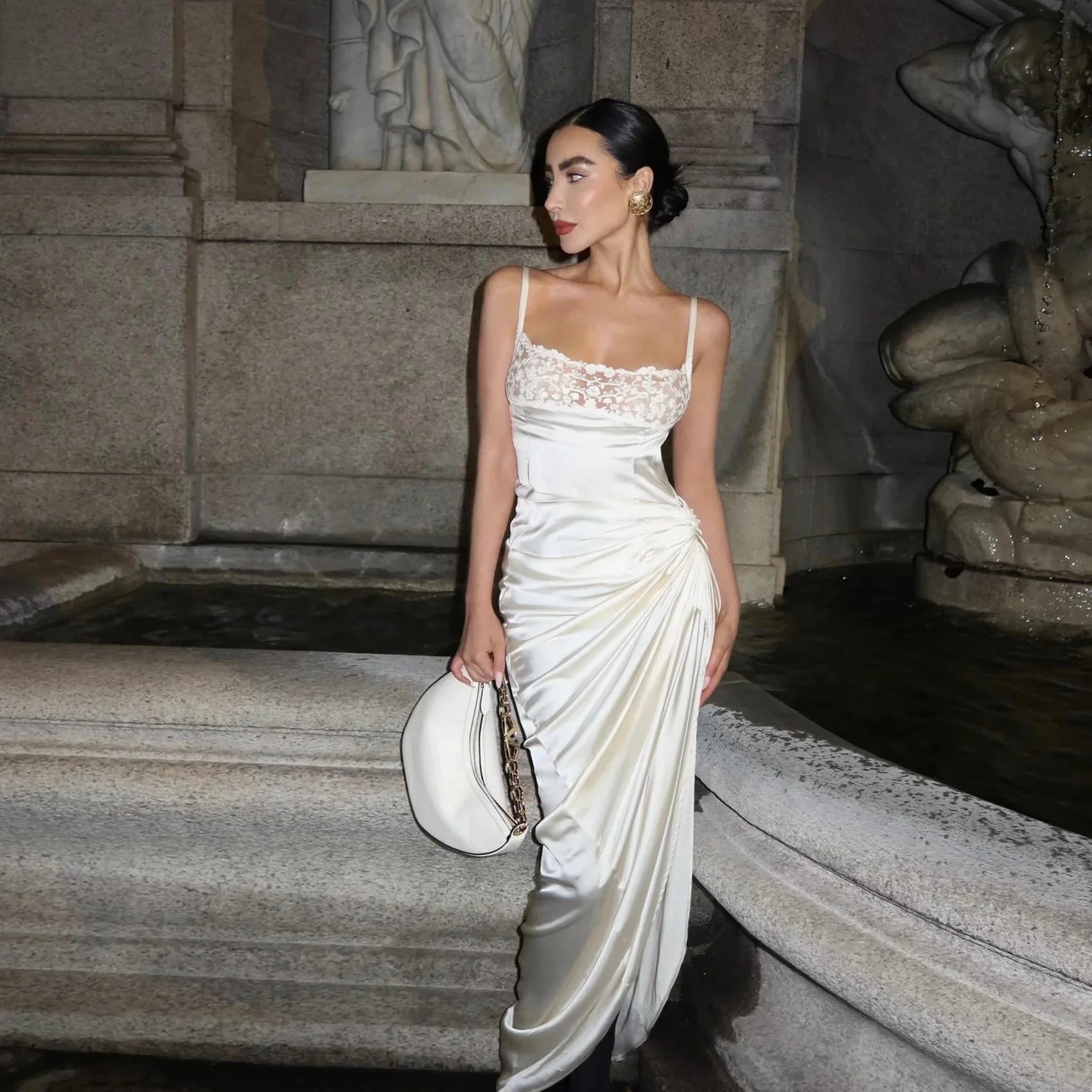 Embrace timeless romance and modern seduction with our White Satin Maxi Dress. Crafted from luxurious satin, this gown features a sheer lace bust, ruched hip, and daring thigh-high slit for added drama. Adjustable straps and delicate detailing sculpt a silhouette that guarantees a red-carpet moment. This cinematic gown is the epitome of sophistication and grace, ensuring you shine at any event. Discover more style inspirations on Instagram @mermaid_way and enjoy a complimentary exchange for size changes.