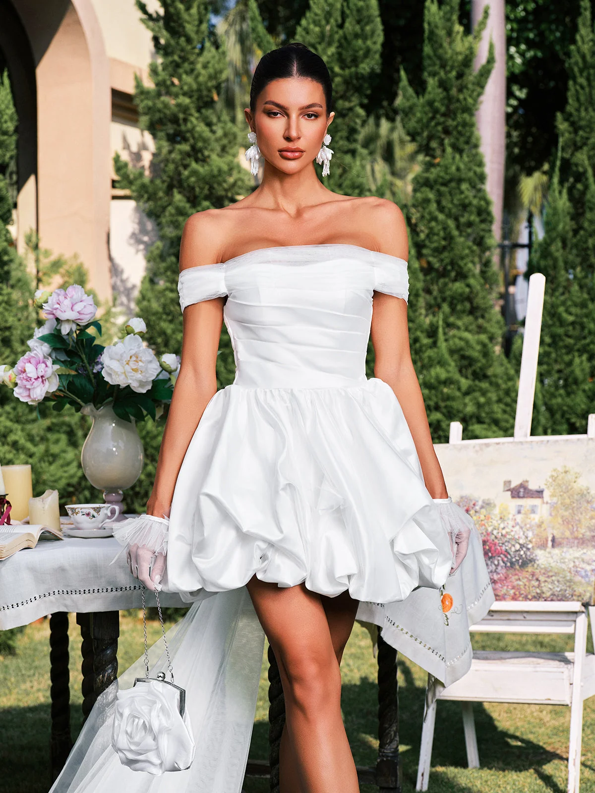 Elevate your style with the White Satin Ruched Off-Shoulder Dress! Made with luxurious satin fabric, this dress features an elegant off-shoulder neckline and sophisticated ruched detailing. Perfect for special occasions, it exudes confidence and glamour, ensuring you stand out in the crowd. Feel empowered and chic with this stunning dress that complements your grace effortlessly. Crafted from 100% Polyester with slight stretch for comfort. Dry clean only. Please note: Gloves not included. Color may vary in images due to lighting.