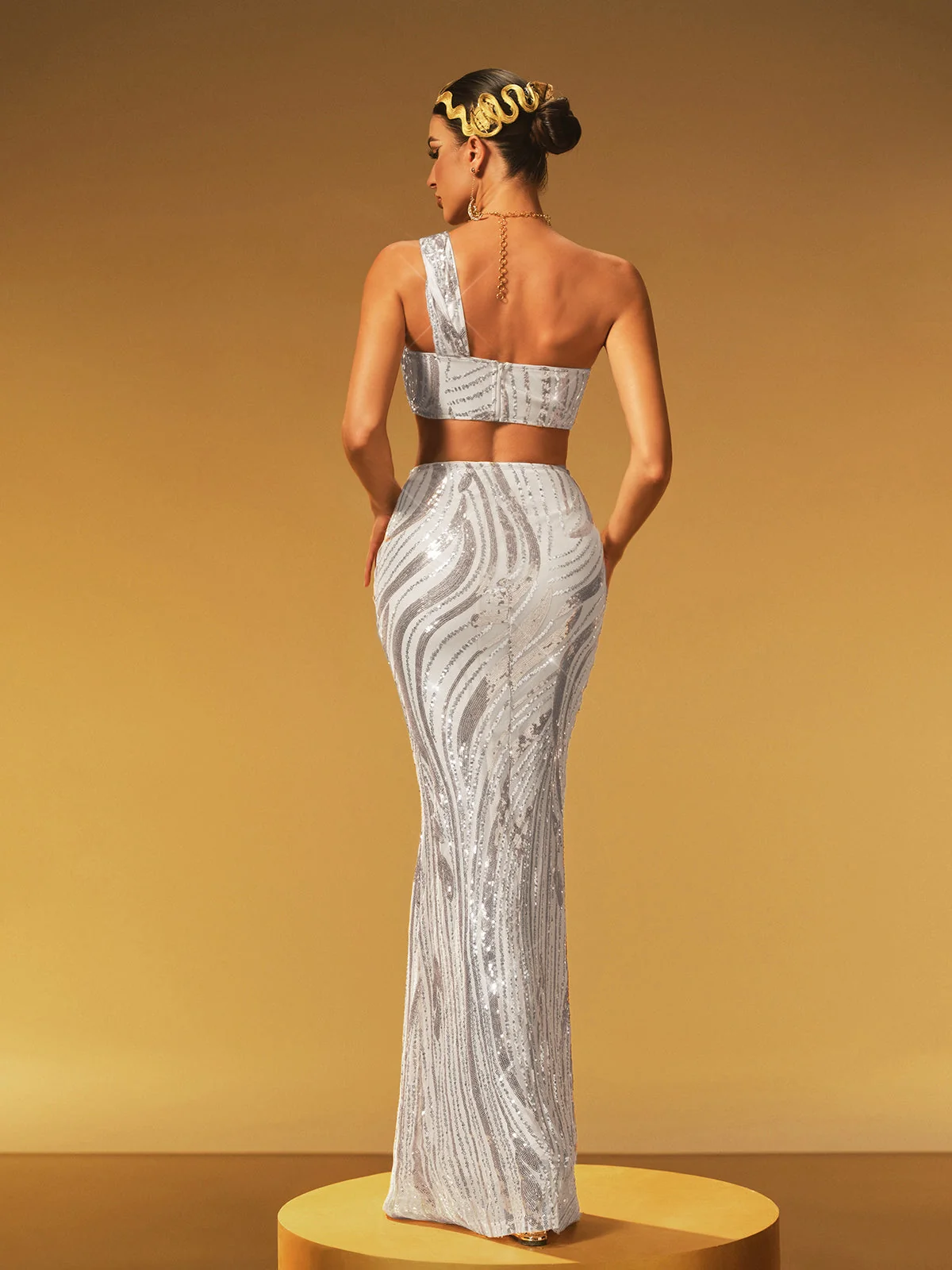 Make a statement in the stunning White Sequin One Shoulder Skirt Set. This chic outfit features a stylish one-shoulder top paired with a dazzling sequin skirt, blending modern style with glamorous sparkle. Perfect for special occasions or nights out, this ensemble enhances your figure and exudes confidence. Crafted from 100% Polyester with an invisible zipper back closure, this non-stretch set is dry clean only. Note: Lighting may affect color appearance. Model wears size S.