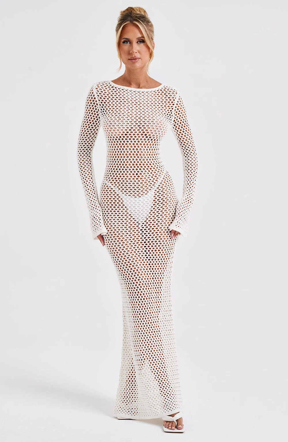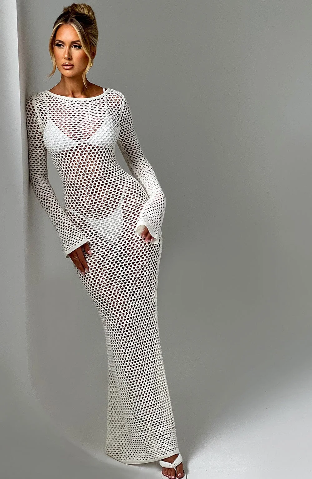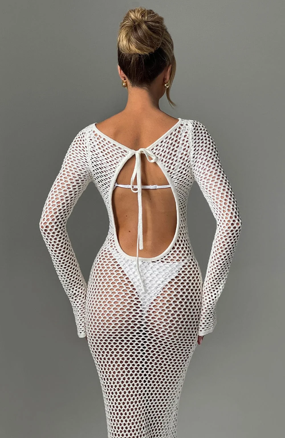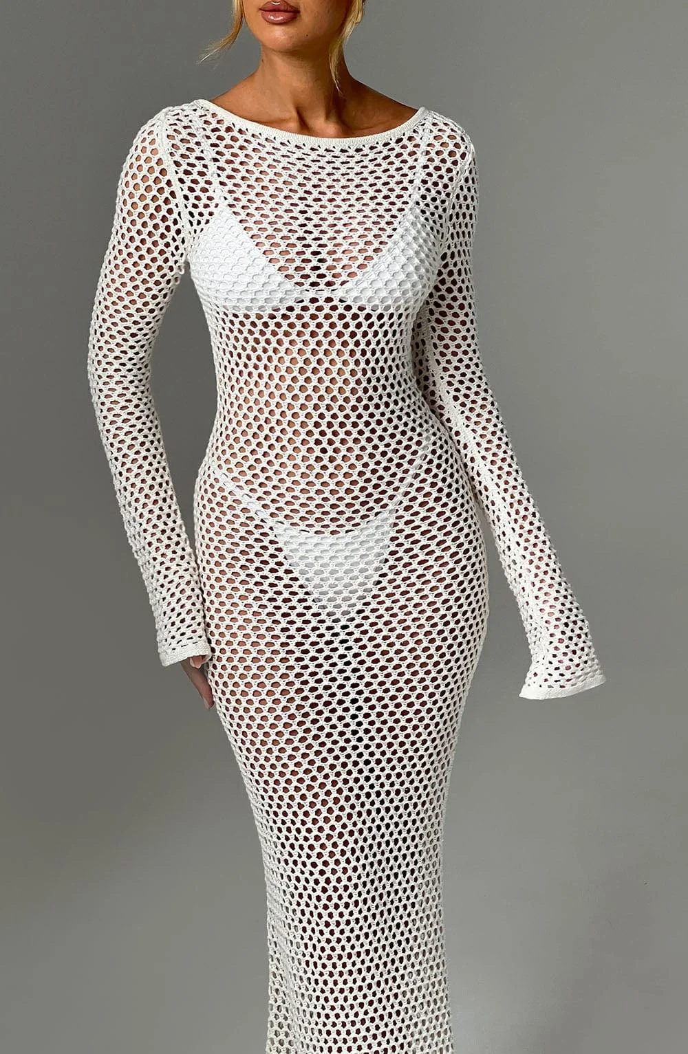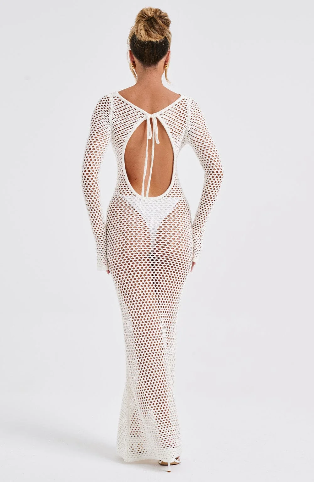 Indulge in the elegance of the White Sheer Knit Maxi DressMoana. Crafted for long balmy days, this premium dress features a stunning low back, high neckline, and flattering long flared cuffs. Perfect for daytime outings or festive evenings, pair it with flowing hair, golden accents, and stylish heels to complete your look. Embrace the airy comfort of sheer knit fabric and the allure of a tie at the top of your neck. Whether its a holiday, festival, or summer adventure, this breathtaking maxi dress in white promises sophistication and charm. Available in XS to XXL sizes.