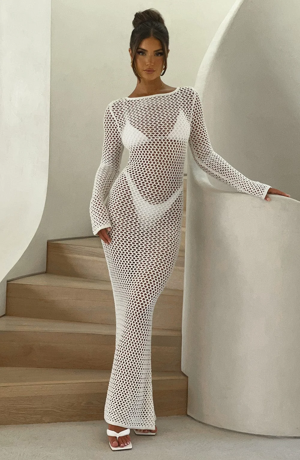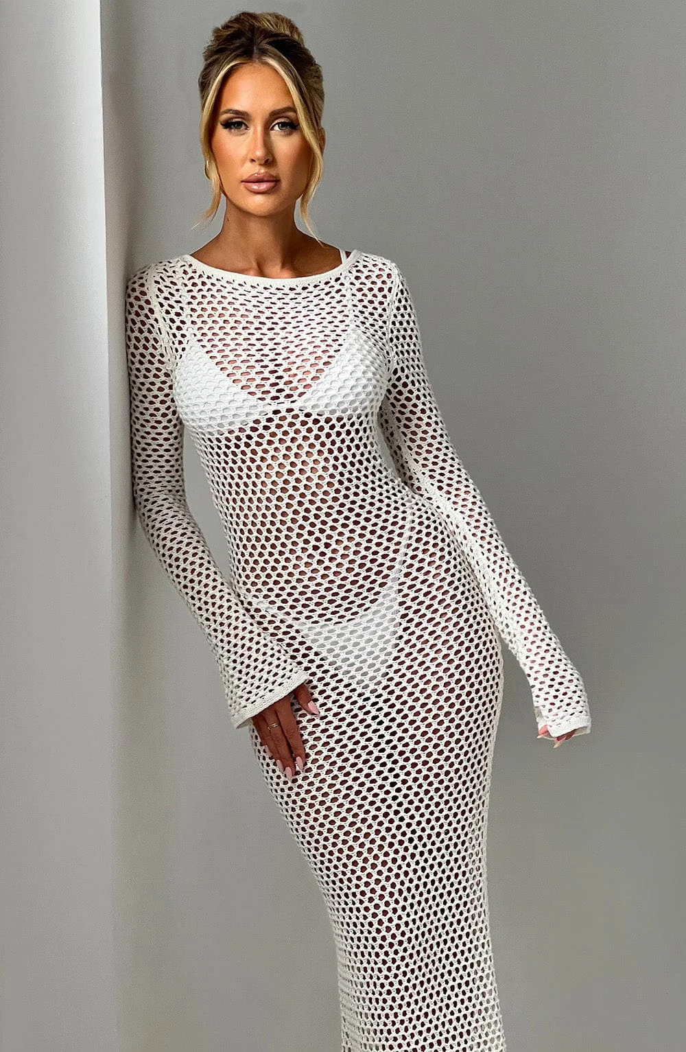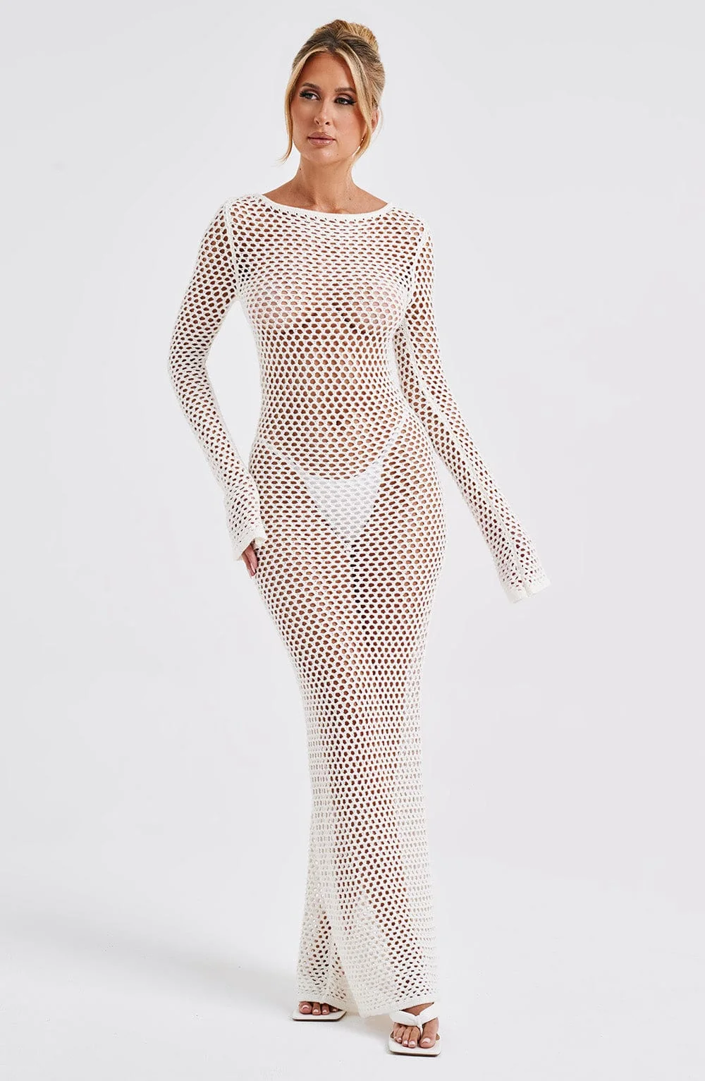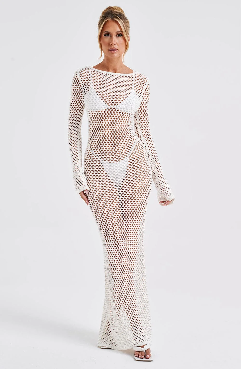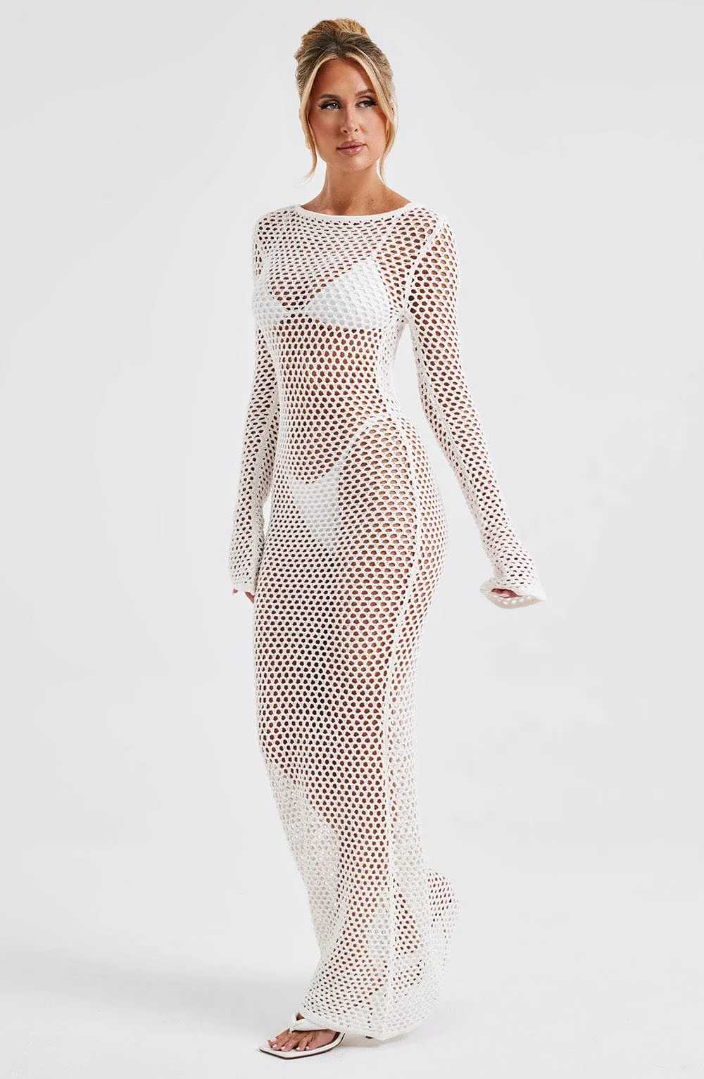 Indulge in the elegance of the White Sheer Knit Maxi DressMoana. Crafted for long balmy days, this premium dress features a stunning low back, high neckline, and flattering long flared cuffs. Perfect for daytime outings or festive evenings, pair it with flowing hair, golden accents, and stylish heels to complete your look. Embrace the airy comfort of sheer knit fabric and the allure of a tie at the top of your neck. Whether its a holiday, festival, or summer adventure, this breathtaking maxi dress in white promises sophistication and charm. Available in XS to XXL sizes.