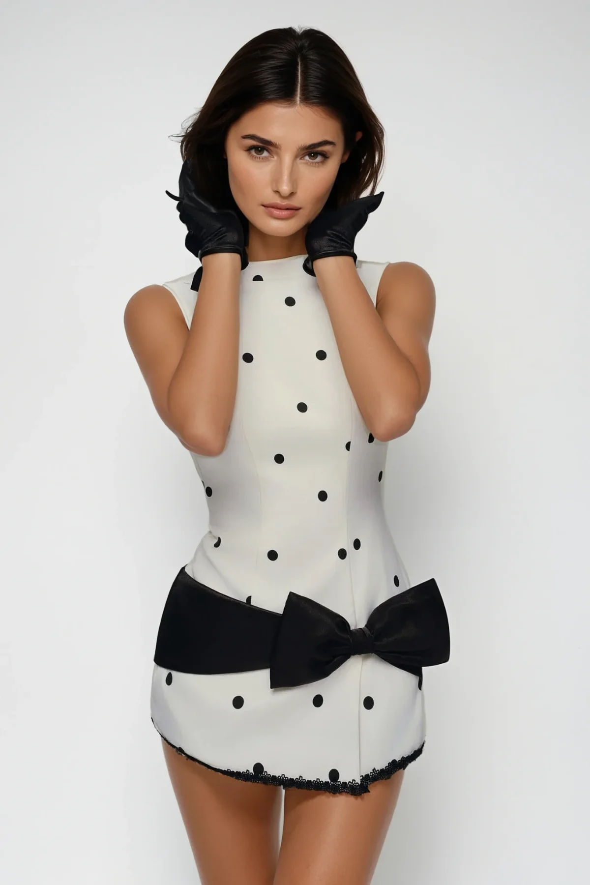 Elevate your style with the White Sleeveless Bow Detail Mini Dress . Crafted with attention to detail, this dress features a delicate dotted pattern and a flattering sleeveless cut. The sophisticated bow detail adds refined charm, perfect for casual outings or stylish events. Enjoy a comfortable and polished fit with its tailored silhouette. Whether youre aiming for a romantic or coquette look, this dress exudes timeless femininity with a modern twist. Non Stretch. Care Instructions: Gentle machine wash. Please note that color may vary slightly due to lighting.