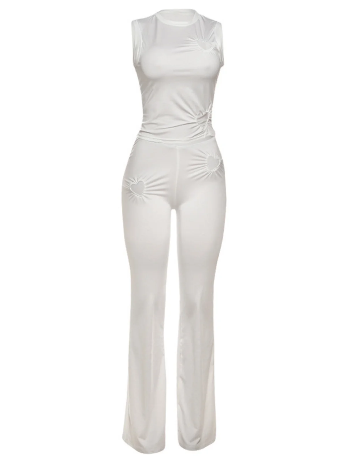 Unleash your inner fashion icon with our trendy White Sleeveless Cutout Heart Matching Pants Set. This set is designed to make a bold statement with cutout heart details, offering comfort and style in equal measure. Crafted from 100% Polyester with a slight stretch, this chic set is perfect for those looking to turn heads and exude confidence. Dry clean only. Please note that colors may vary slightly due to lighting. Embrace the true essence of modern fashion with this stylish ensemble. Model is wearing size S.