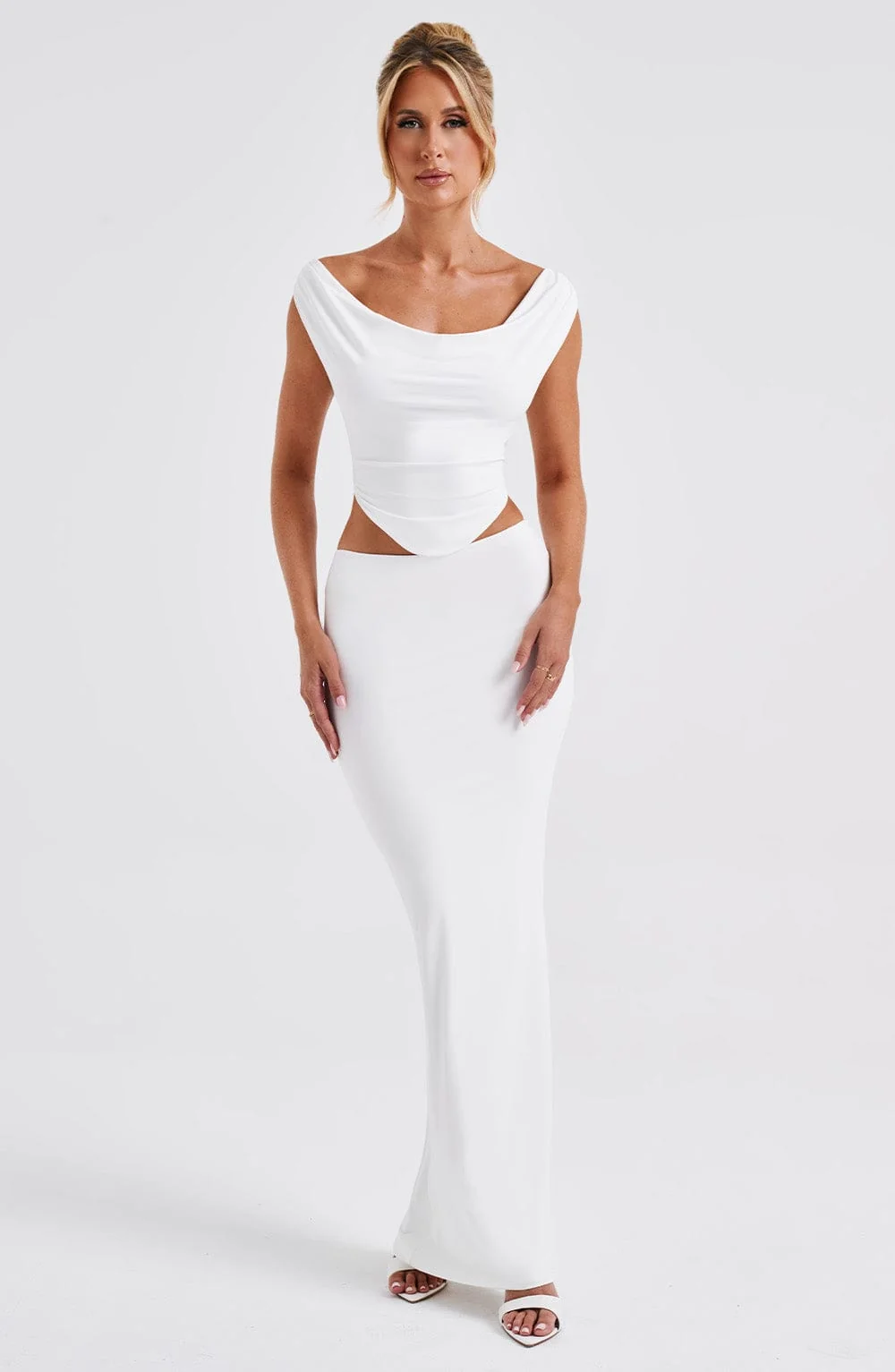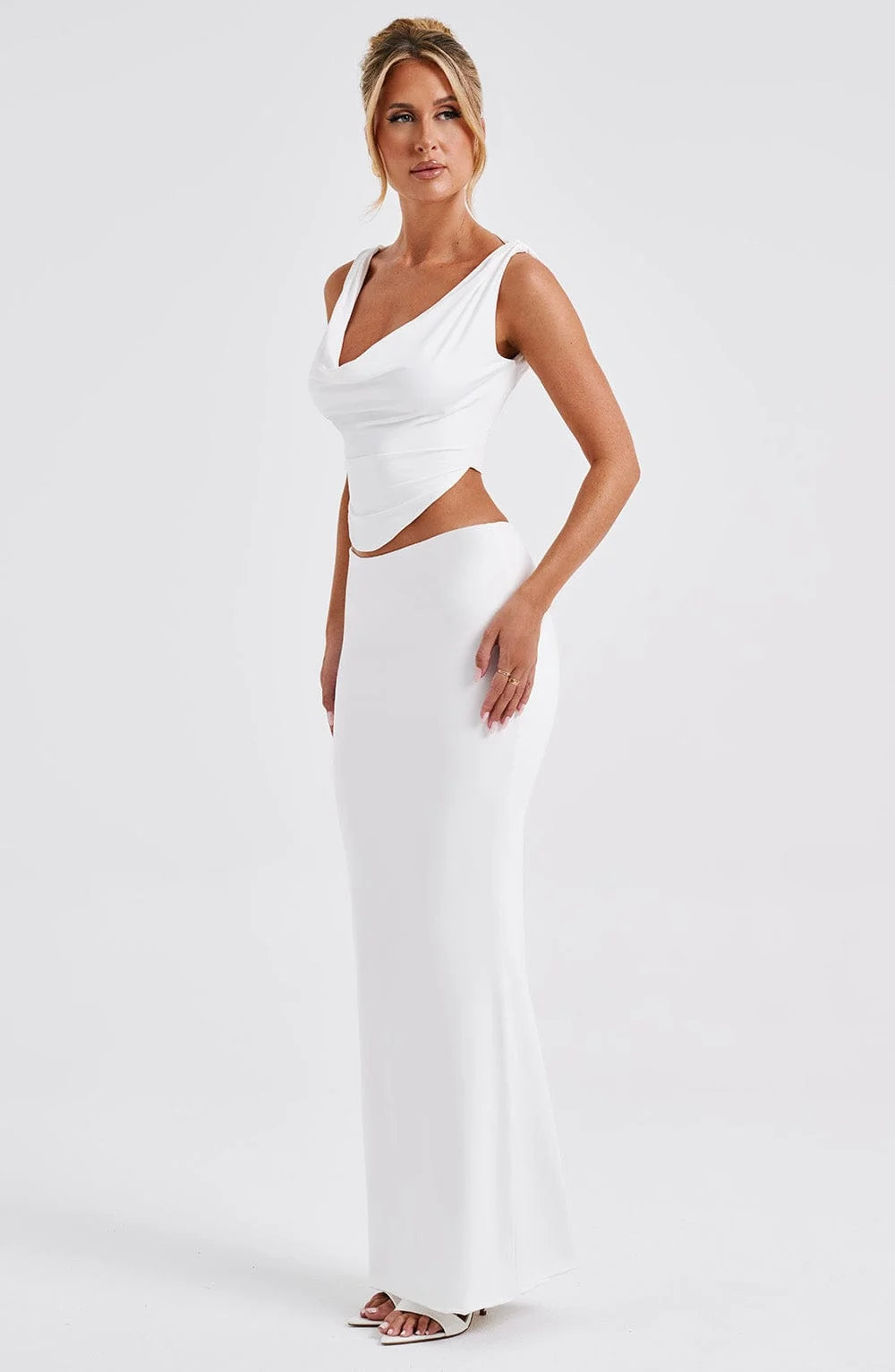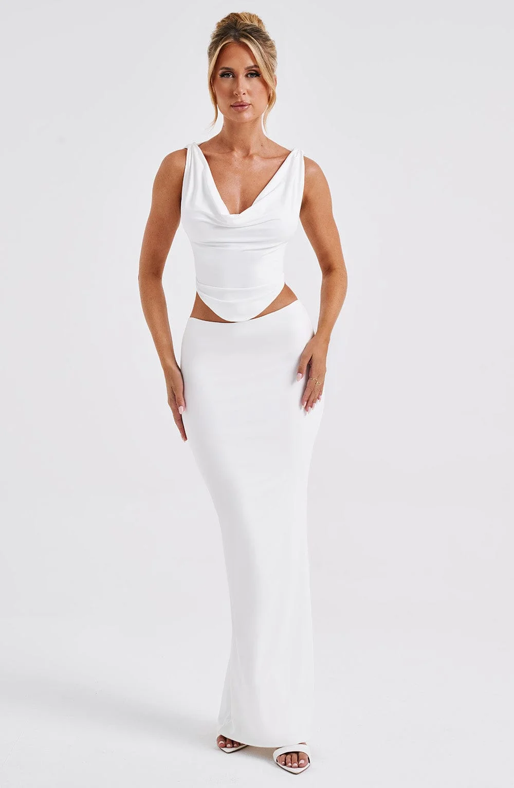 Upgrade your wardrobe with the White Slinky Cowl Neck Crop Top from DIA. This premium top in soft jersey fabric features a flattering fit, shaped hem, and cowl front and back neckline. Perfect for pairing with denim, skirts, and more. The top is fully lined and includes a tie-back closure. Embrace the cropped length for a trendsetting look. Ideal for bridal, festival, party, holiday, and everyday wear. Available in sizes XS to XXL.