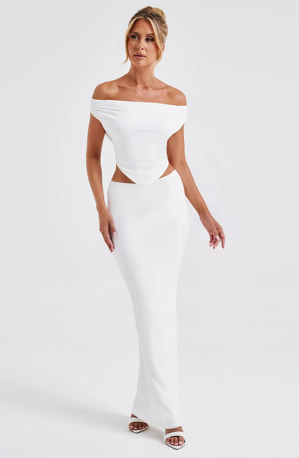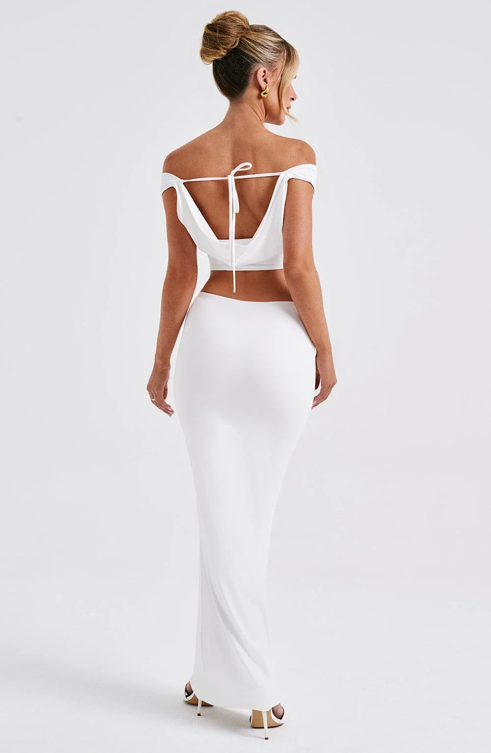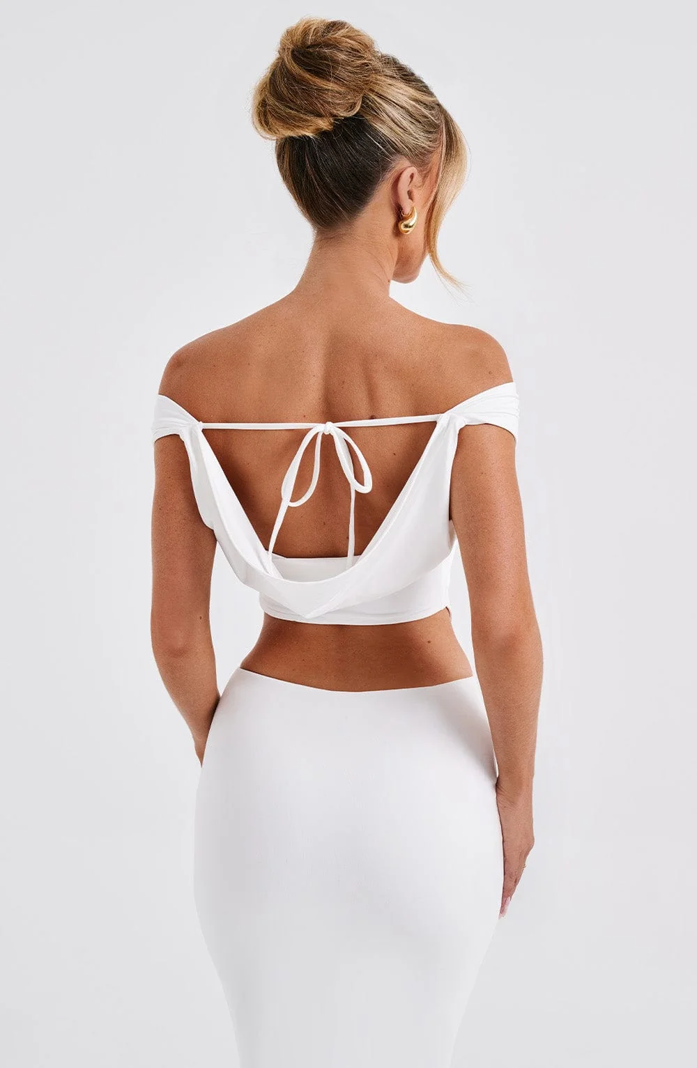 Upgrade your wardrobe with the White Slinky Cowl Neck Crop Top from DIA. This premium top in soft jersey fabric features a flattering fit, shaped hem, and cowl front and back neckline. Perfect for pairing with denim, skirts, and more. The top is fully lined and includes a tie-back closure. Embrace the cropped length for a trendsetting look. Ideal for bridal, festival, party, holiday, and everyday wear. Available in sizes XS to XXL.