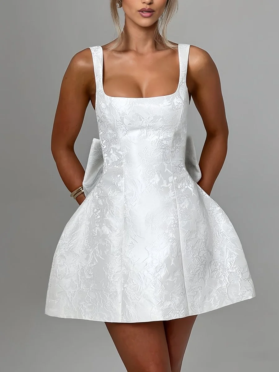 Indulge in luxury with this jacquard satin A-line homecoming dress in elegant white. The structured square neckline, flattering short length, sleeveless design, and lace-up back offer a modern, feminine charm. Complete with an oversized bow for a playful yet sophisticated touch, making it perfect for homecoming, cocktail evenings, or special parties. Stand out with timeless style and embrace the Myrrine dress as your go-to choice. Silhouette: A-Line. Fabric: Jacquard Satin. Color: White. Length: Short. Neckline: Square Neck. Sleeves: Sleeveless. Back: Lace-up. Embellishment: Bowknot.