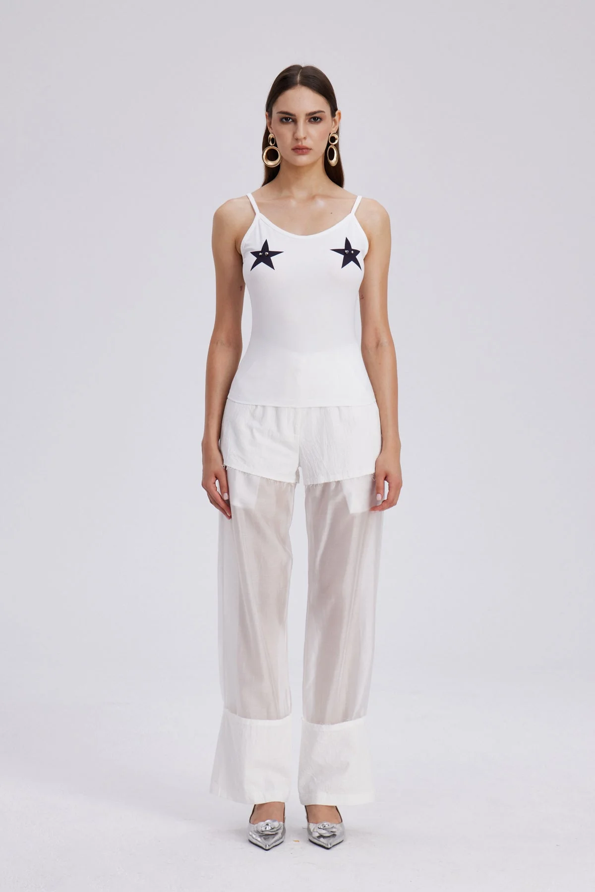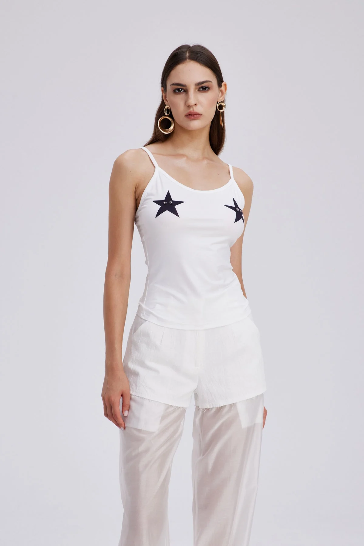 Elevate your style with the White Star Spaghetti Womens Top . This bodycon top features a sleek silhouette designed to enhance your natural shape. Embrace comfort and style with delicate spaghetti straps for a minimalist yet refined look. Whether layered or worn alone, this top is a versatile addition to your wardrobe, offering a contemporary edge. Experience non-stretch comfort with a gentle machine wash care routine. Add a touch of urban edge to your outfit with this perfect blend of modernity and grace. Find yours today!