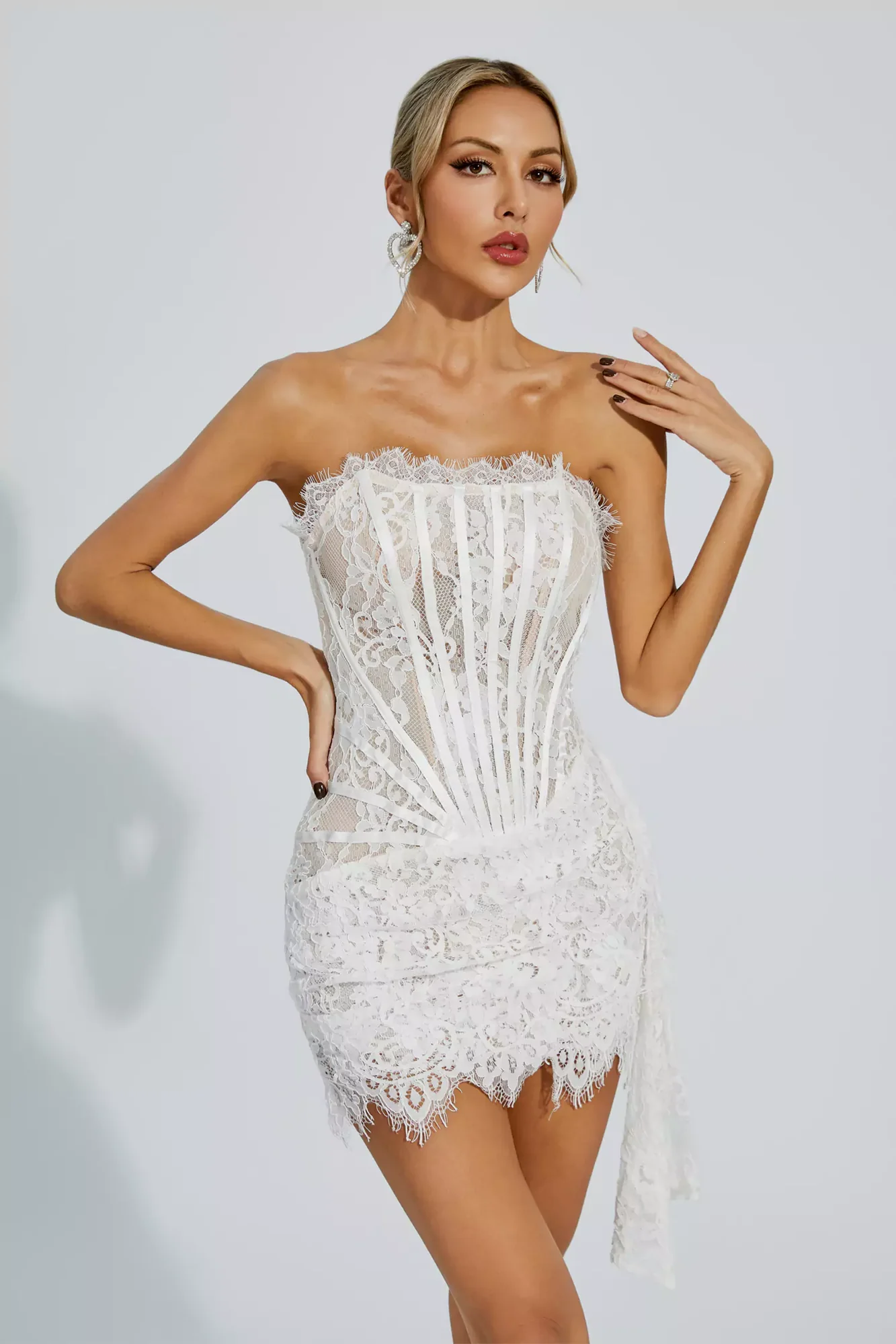 Elevate your style with this stunning white mini dress featuring delicate lace appliques that exude romance. The strapless design beautifully showcases your shoulders, making it perfect for any special occasion. This dress will boost your confidence and make you feel absolutely beautiful. The hidden zipper closure, floral details, and fishbone accents add to its charm. Care instructions include dry cleaning only. The dress is lined with 95% cotton and a blend of 10% cotton, 85% polyester. Please note that color may vary due to lighting. The item runs true to size based on our size chart, ensuring the perfect fit. Refer to our size chart for guidance; do not size up or down.