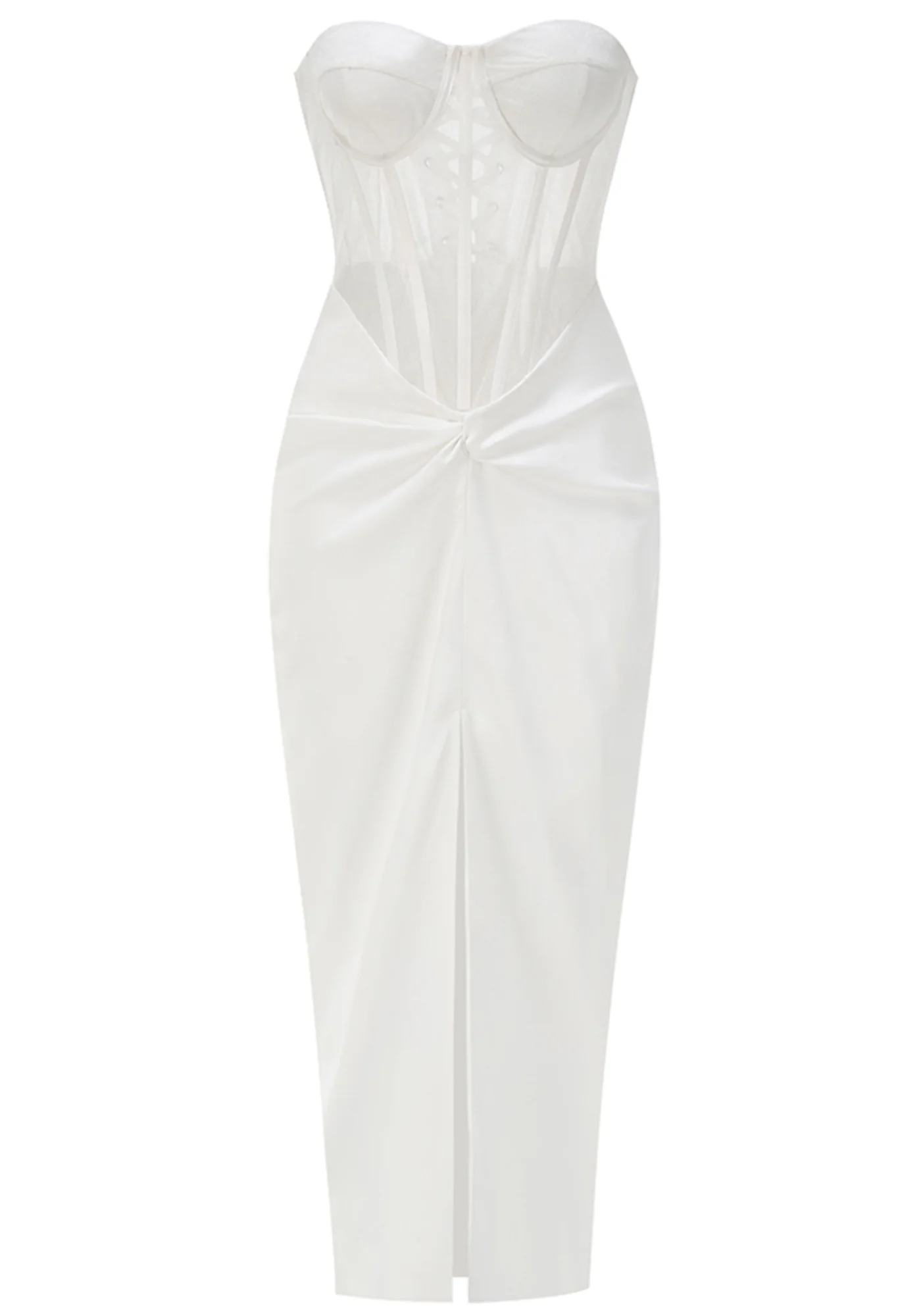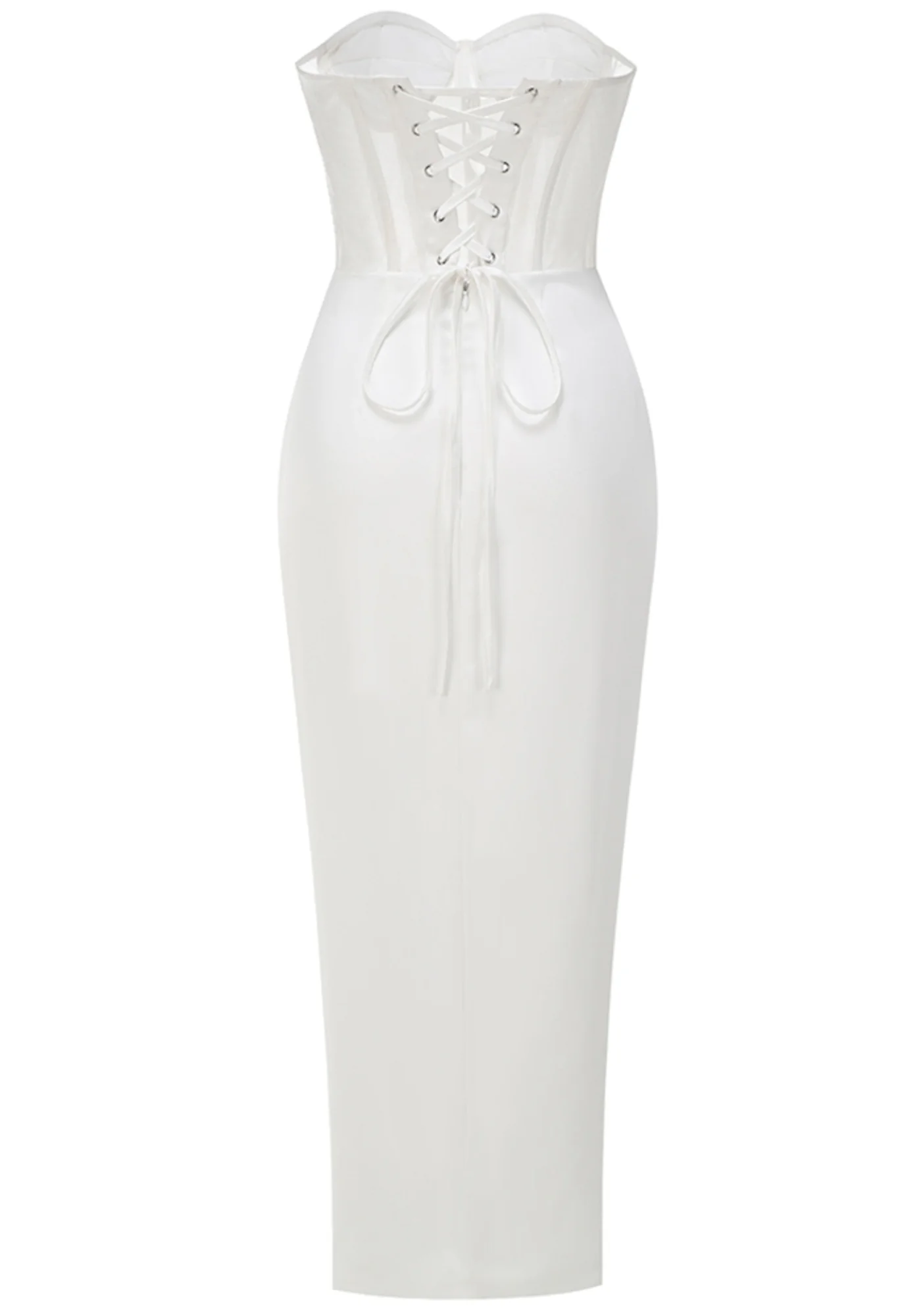 This elegant White Strapless Mesh Corset Maxi Dress features a strapless and sleeveless design with a bustier detail, mesh insert, draped design, and corset detail at the back. Crafted from a blend of Polyester and Cotton, it boasts delicate sewing and hemming for durability. The YKK zipper ensures reliability. Dry clean only. Length: Maxi. Care instructions included for longevity. Variations available in XS, S, M, and L. Color may vary due to lighting. True beauty in every stitch.