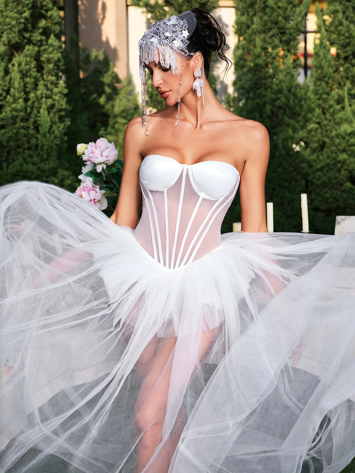 Elevate your style with our White Strapless Mesh Maxi Dress. This elegant dress features a flattering corset waist, accentuating your curves with a flowy mesh skirt that adds a touch of glamour. Perfect for special occasions, this dress ensures confidence and sophistication. Crafted from 100% Polyester with a slight stretch for comfort. For best care, dry clean only. Please note that colors may vary due to lighting. Model is wearing size S.