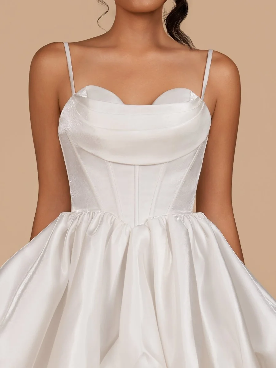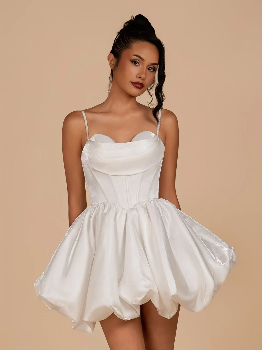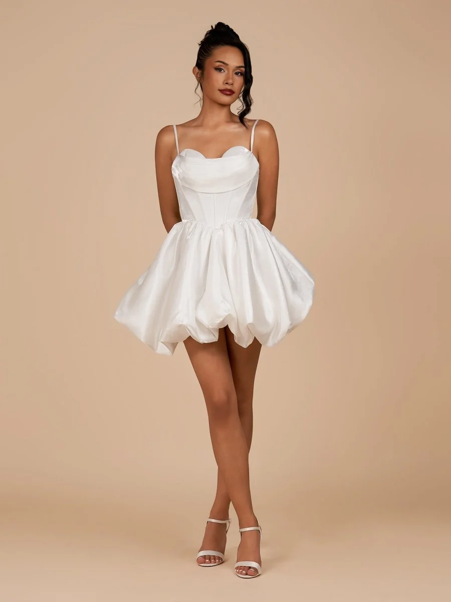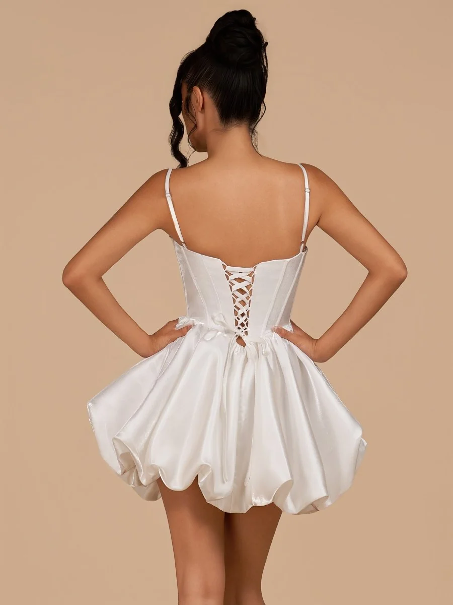This charming white satin mini dress features a sweetheart neckline, A-line silhouette, and corset bodice for a romantic and flattering look. The playful bubble hem adds volume, while the lace-up back ensures a perfect fit. Ideal for cocktail parties or special occasions, this dress exudes elegance and style. Available in lilac, champagne, lavender, pink, and sky blue. Perfect for twirling the night away!