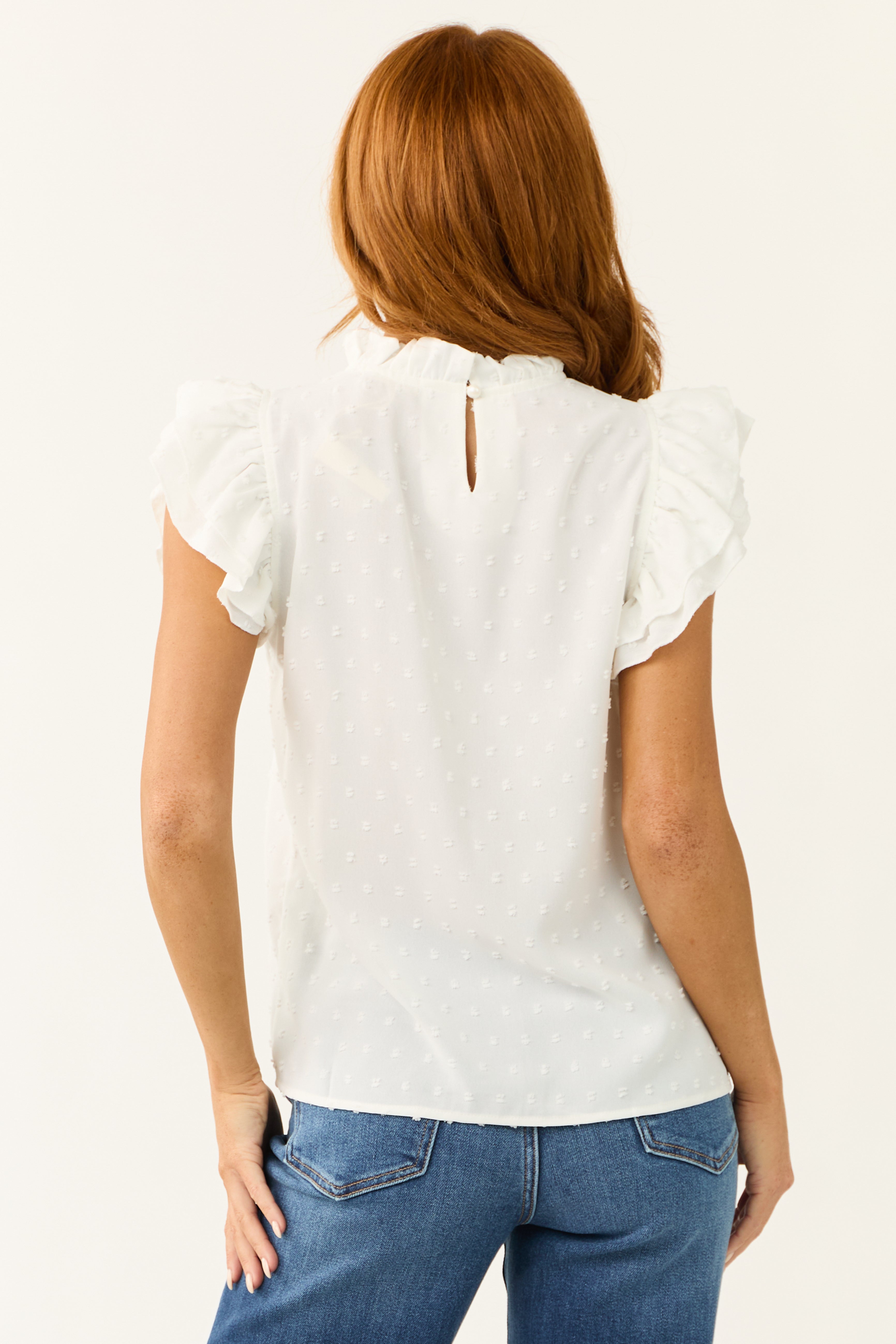 Indulge in the classic elegance of our White Swiss Dot Short Sleeve Ruffle Neck Top. This stunning top features delicate Swiss dot fabric, a high ruffle neckline, and a keyhole back with button closure for a touch of sophistication. Crafted from non-stretchy woven polyester, this top offers timeless style and effortless charm. Perfect for date nights or daytime outings, this top is a wardrobe essential. Available in sizes S, M, and L. Hand wash only. Model is wearing a size Small. Model’s Profile: Size 1, Height 55″, Bust 31″, Waist 24″